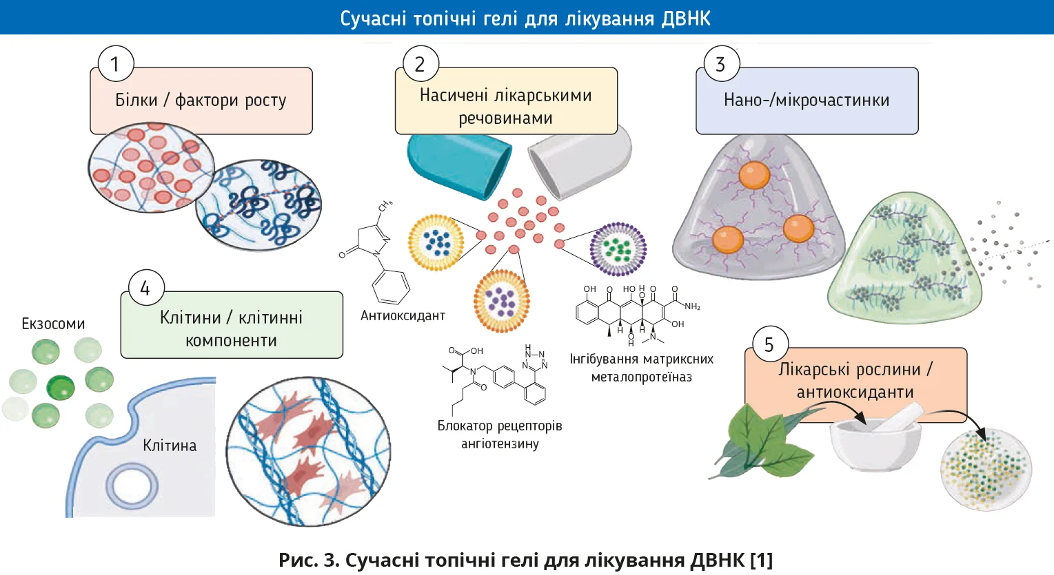біоматеріали, передусім гідрогелі: вони біосумісні, утримують вологу, можуть бути прозорими для візуального контролю та слугують матрицею для локального доставлення активних речовин [1, 5]. Завдяки цьому гідрогель перетворюється з пасивного покриття на терапевтичну платформу. Гідрогелі можуть містити білки / фактори росту, ліки й лікарські рослини, клітини та клітинні компоненти, нано- та мікрочастинки (рис. 3).