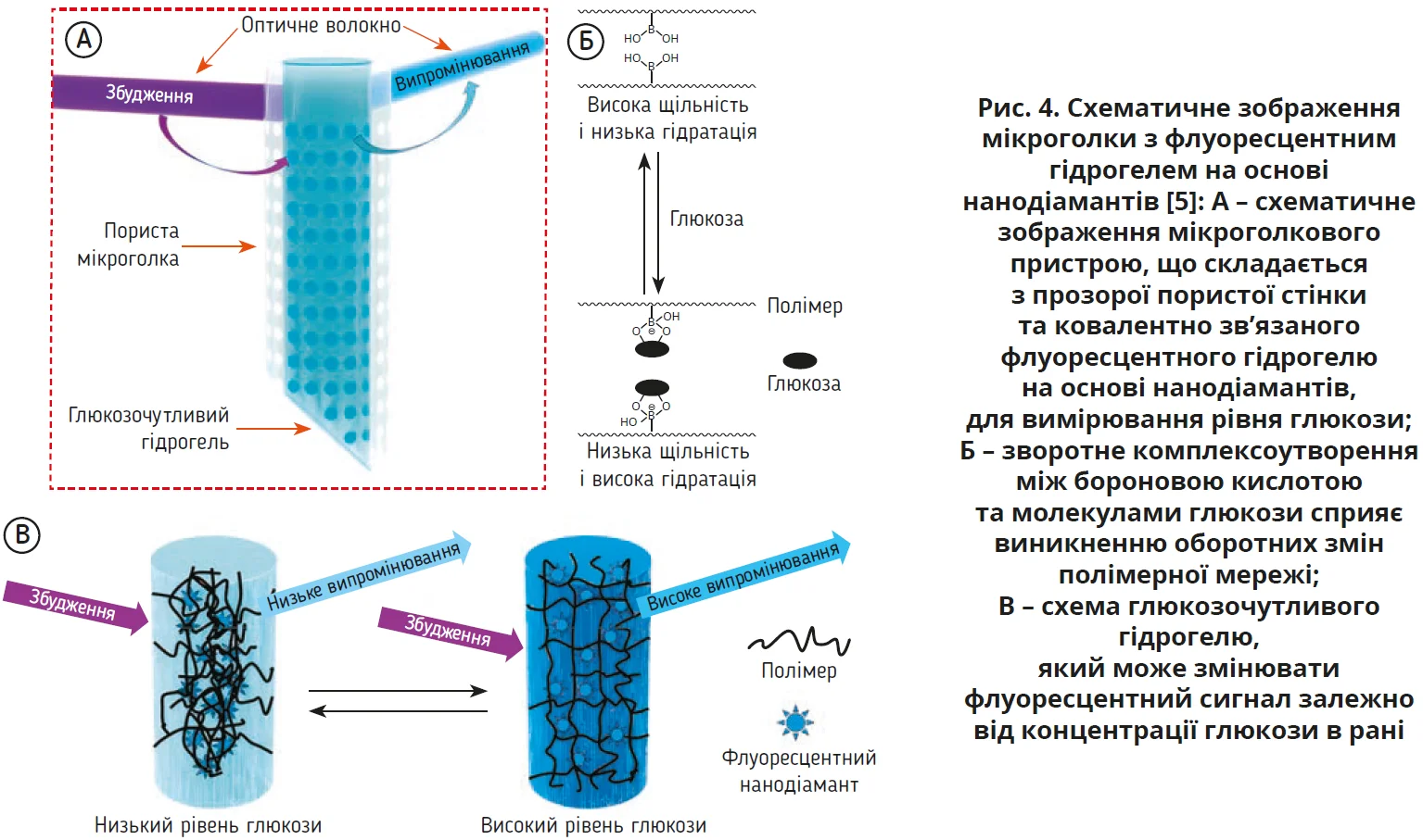 Є ще флуоресцентні сенсори (рис. 4). Вони точніші та здатні перетворювати коливання вмісту глюкози чи pH на зміну світіння вбудованого флуорофора. Технічно таку здатність реалізують або через молекули, що вибірково зв’язують глюкозу (наприклад, боронатні групи), або через ферментні системи (часто на основі глюкозооксидази). Флуоресценція дає змогу отримувати чутливіший сигнал і відстежувати його в динаміці, а для зменшення залежності від зовнішніх умов інколи застосовують раціометричний підхід: у пов’язку вбудовують сенсор, який навмисно формує два флуоресцентні канали (наприклад, два барвники або два піки випромінювання одного зонда), й оцінюють не абсолютну яскравість, а їх співвідношення. Альтернатива – часовий режим, коли аналізують не інтенсивність, а тривалість світіння після підсвічування; це також робить результат менш чутливим до освітлення, товщини пов’язки чи кількості ексудату. Обмежують цей метод необхідність підсвічування та зчитування (потрібна камера смартфона / спеціальний зчитувач), а також високі вимоги до стабільності сенсорного шару в рановому ексудаті. Поверхня сенсору також може «обростати» білками, клітинами та мікроорганізмами (інколи з формуванням біоплівки), через що сигнал слабшає або спотворюється (так званий біофулінг); інколи явище біофулінгу призводить до руйнування сенсора.