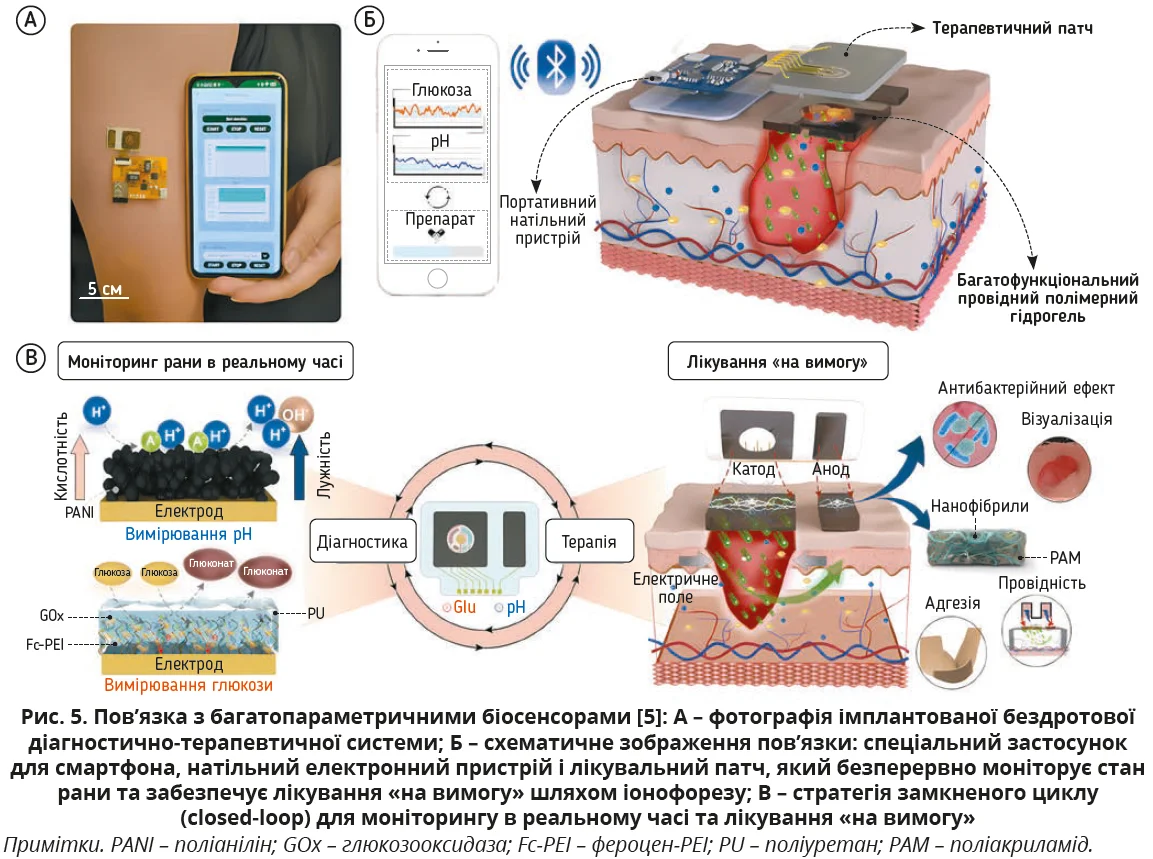 Найтехнологічнішими є багатопараметричні пов’язки, котрі одночасно відстежують глюкозу, pH, температуру, вологість або механічний тиск. До їхнього складу входить натільний електронний пристрій, який збирає дані із сенсорів та отримує команди від мобільного застосунку на смартфоні, за допомогою якого подається команда щодо введення потрібного препарату (рис. 5). Такі пов’язки максимально повно відображають стан діабетичної рани, однак є значно складнішими у виготовленні й інтерпретації. Більшість таких систем поки що перебуває на етапі досліджень і пілотних розробок.