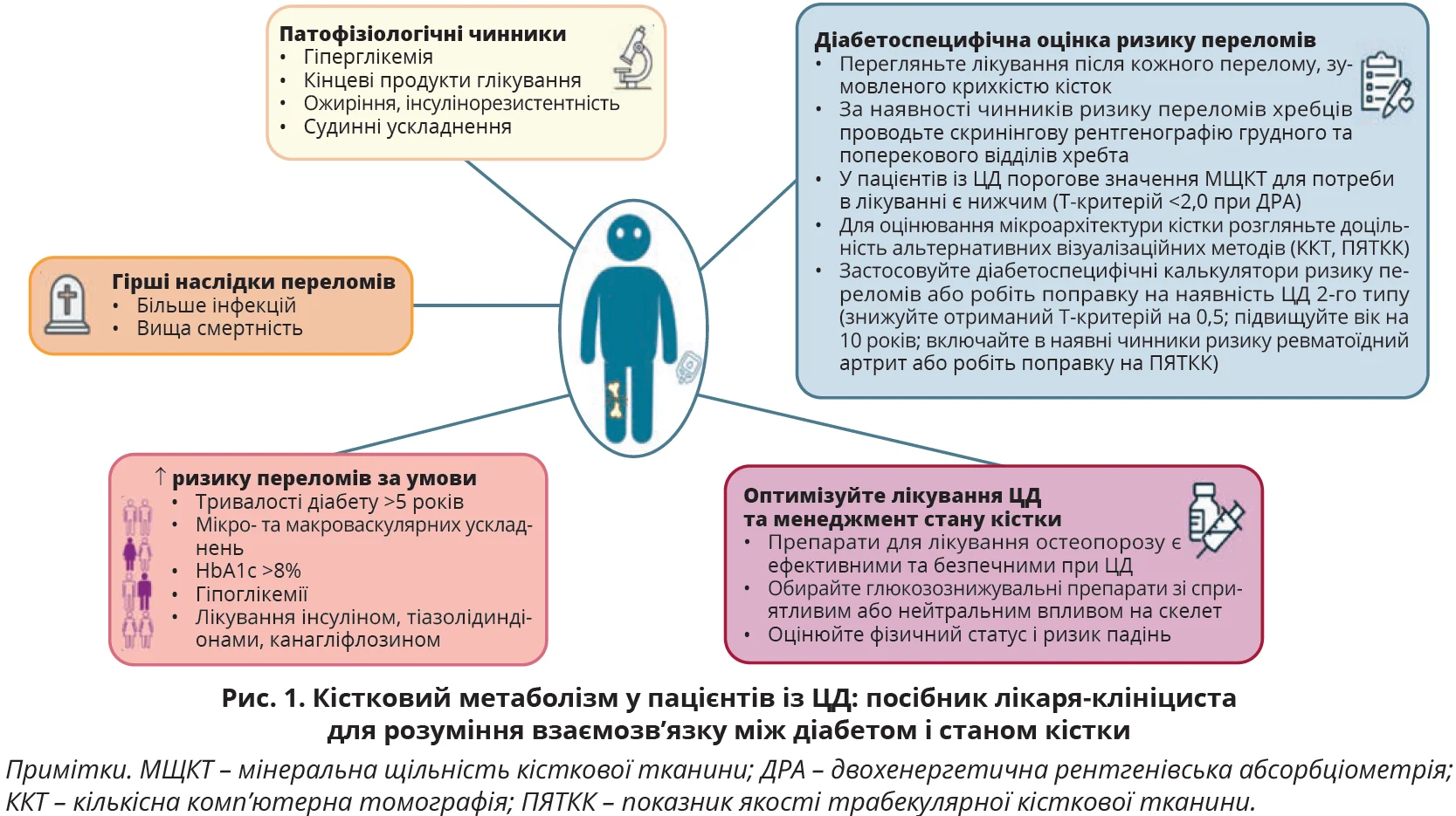 Оцінка стану скелета за наявності ЦД має певні обмеження: зокрема, визначення мінеральної щільності кісткової тканини та калькулятори ризику переломів недооцінюють асоційований з кістковою тканиною ризик у цих пацієнтів. Метаболічні чинники, що впливають на стан кісток, охоплюють гіперглікемію, гіперінсулінемію й ожиріння. Цим чинникам властиві численні, подекуди суперечливі впливи на стан клітин кісткової тканини, її структуру та судини. Крім того, певні чинники, пов’язані з діабетом, зокрема його тривалість, рівень глікемічного контролю, судинні ускладнення та приймання медикаментів, можуть безпосередньо впливати на втрату кісткової маси й ризик переломів. У зв’язку з цим при оцінюванні стану кісток у осіб із ЦД слід застосовувати підхід, орієнтований на діабет (рис. 1).