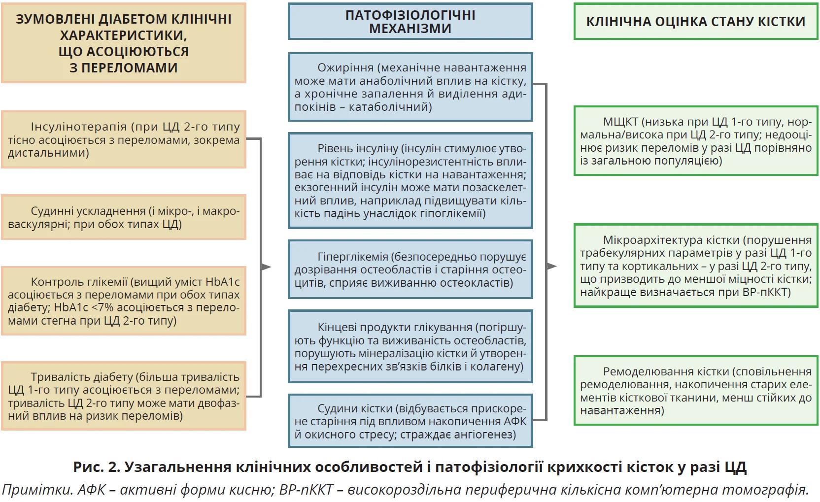 Епідеміологічні дослідження дали змогу виявити клінічні характеристики діабету, що асоціюються з підвищеним ризиком переломів (рис. 2). Однак дотепер не було проведено жодних проспективних досліджень, головною метою яких було би визначення предикторів переломів, пов’язаних із ЦД. Через це незалежний внесок багатьох взаємопов’язаних чинників залишається складним для оцінювання.