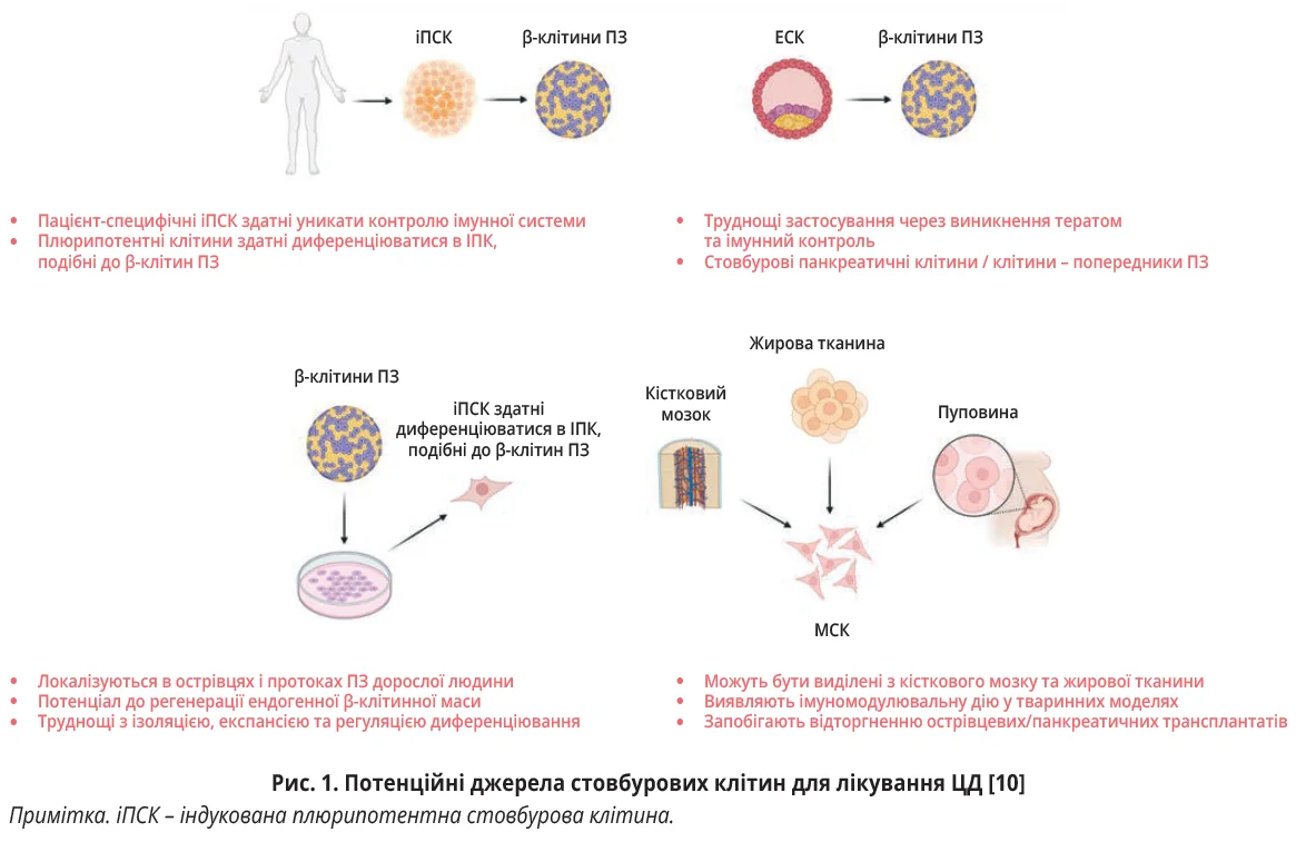 Клітинна терапія ЦД ґрунтується на використанні стовбурових (мезенхімальних, ембріональних) і нестовбурових (клітини кісткового мозку) клітин [3]. Ембріональні стовбурові клітини (ЕСК) одержують з ембріонів на дуже ранніх етапах розвитку. Ці клітини є плюрипотентними та здатні трансформуватися майже в будь-який тип клітин людського організму (рис. 1). Однак їх використання часто є предметом етичних спорів через однозначну загибель ембріона після забору ЕСК, а також унаслідок декількох властивостей плюрипотентних клітин: вони не здатні уникати впливу імунної системи, тобто є імуногенними, а також, імовірно, тератой онкогенними [5].