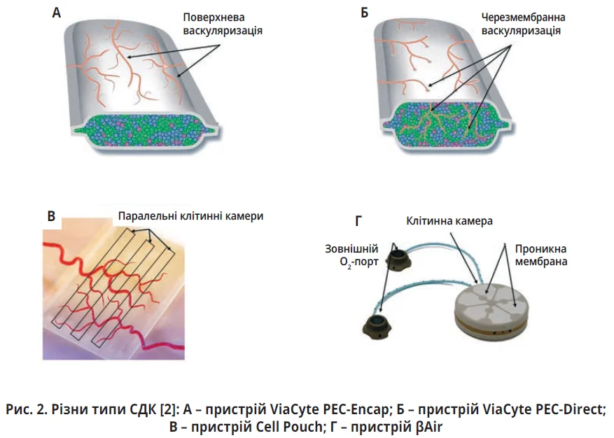 Зазначена стратегія дістала назву «система доставки клітин» (СДК) та використовується вже понад 40 років. Згодом виробництво СДК вдосконалювалося: мікрокапсули почали розміщати в каркасах різної форми, покривати різноманітними гелями. Таким чином були створені макро- та мікропристрої, які забезпечують васкуляризацію й захист інкапсульованих β-клітин від імунного нагляду (рис. 2).