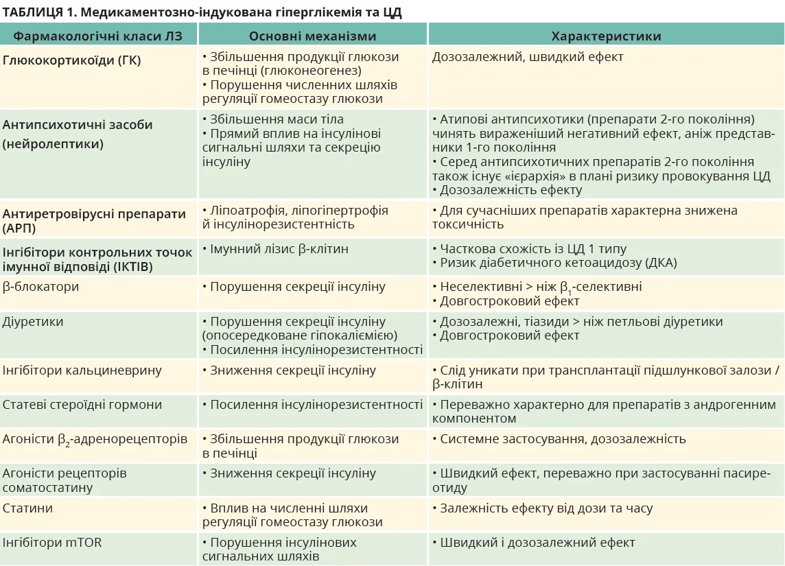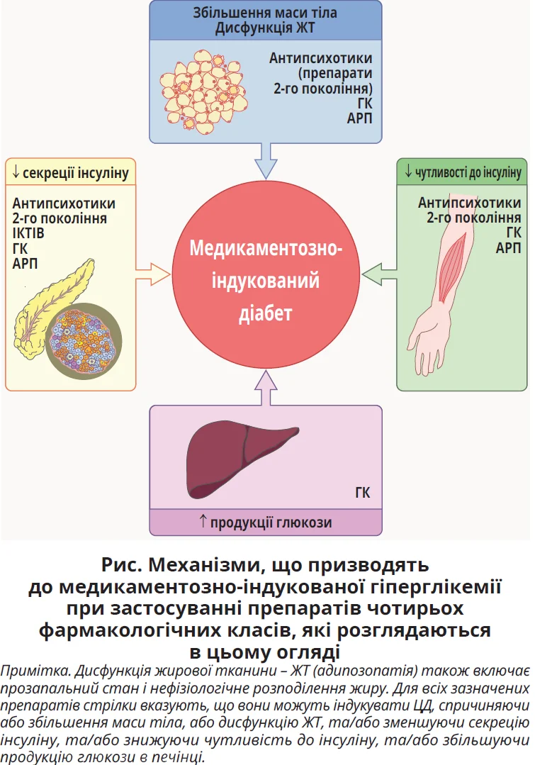 Зростає занепокоєння фахівців через медикаментозно-індуковану гіперглікемію. Точні механізми, за допомогою яких ті чи інші ЛЗ спричиняють гіперглікемію та діабет, іще потребують подальшого вивчення, але вони, ймовірно, є множинними та відрізняються для препаратів різних фармакологічних класів. У разі застосування препаратів деяких фармакологічних класів провідну роль у розвитку ЦД, безсумнівно, відіграють збільшення маси тіла та/або дисфункція ЖТ (адипозопатія).