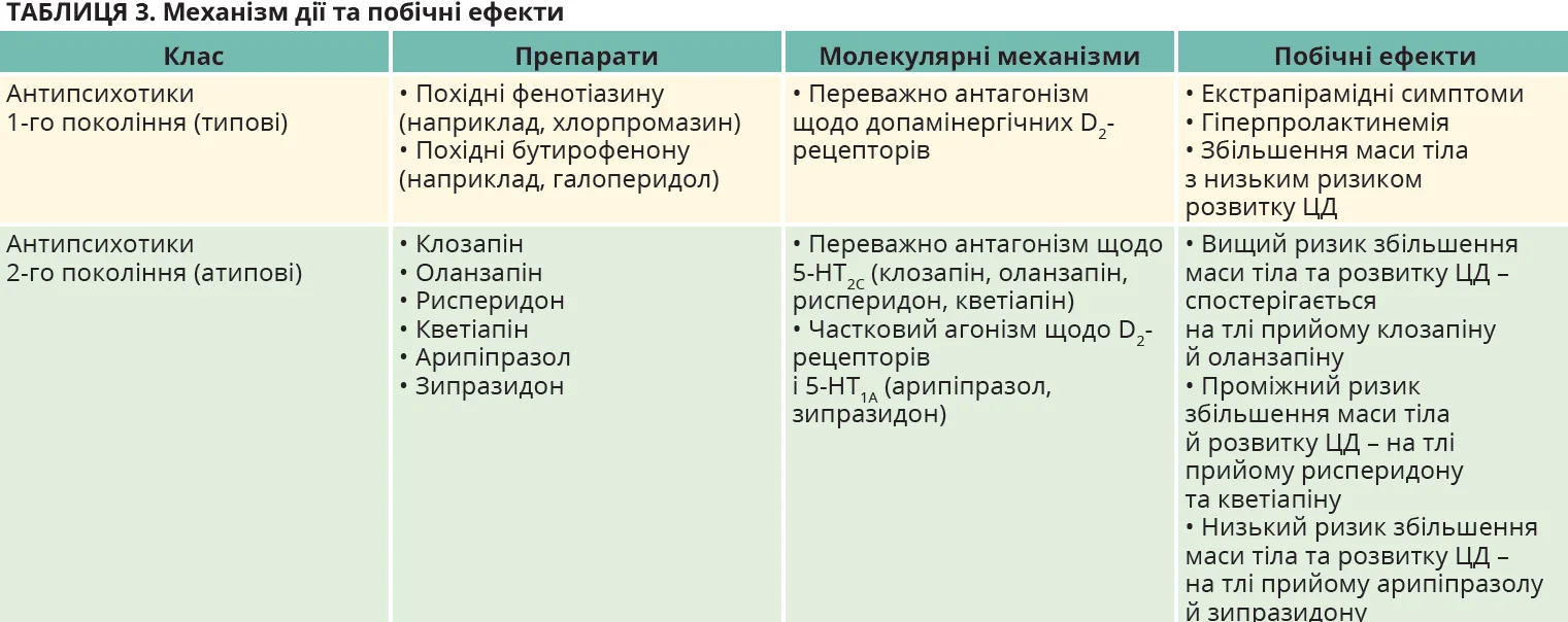 Похідні фенотіазину та бутирофенону є типовими антипсихотичними засобами 1-го покоління. Їхня основна антипсихотична активність зумовлена антагонізмом щодо допамінових D2-рецепторів у головному мозку, що, ймовірно, також призводить до екстрапірамідних рухових розладів і гіперпролактинемії. Антипсихотики 2-го покоління (атипові) були розроблені саме з метою мінімізації ризику виникнення цих побічних ефектів. Вони мають значно нижчу афінність до D2-рецепторів і виявляють свій антипсихотичний ефект через антагонізм до рецепторів 5-гідрокситриптаміну (5-HT2C) або, в разі з арипіпразолом, через агонізм до 5-HT1A [25]. Однак антипсихотики 2-го покоління можуть блокувати й рецептори для інших нейротрансмітерів у головному мозку (наприклад, адренергічні α1-рецептори, H1-рецептори гістаміну та мускаринові рецептори). У міру розширення використання антипсихотиків 2-го покоління почали з’являтися повідомлення про випадки значного збільшення маси тіла, дебют ЦД або погіршення перебігу вже наявного ЦД, а також про дисліпідемію [26].