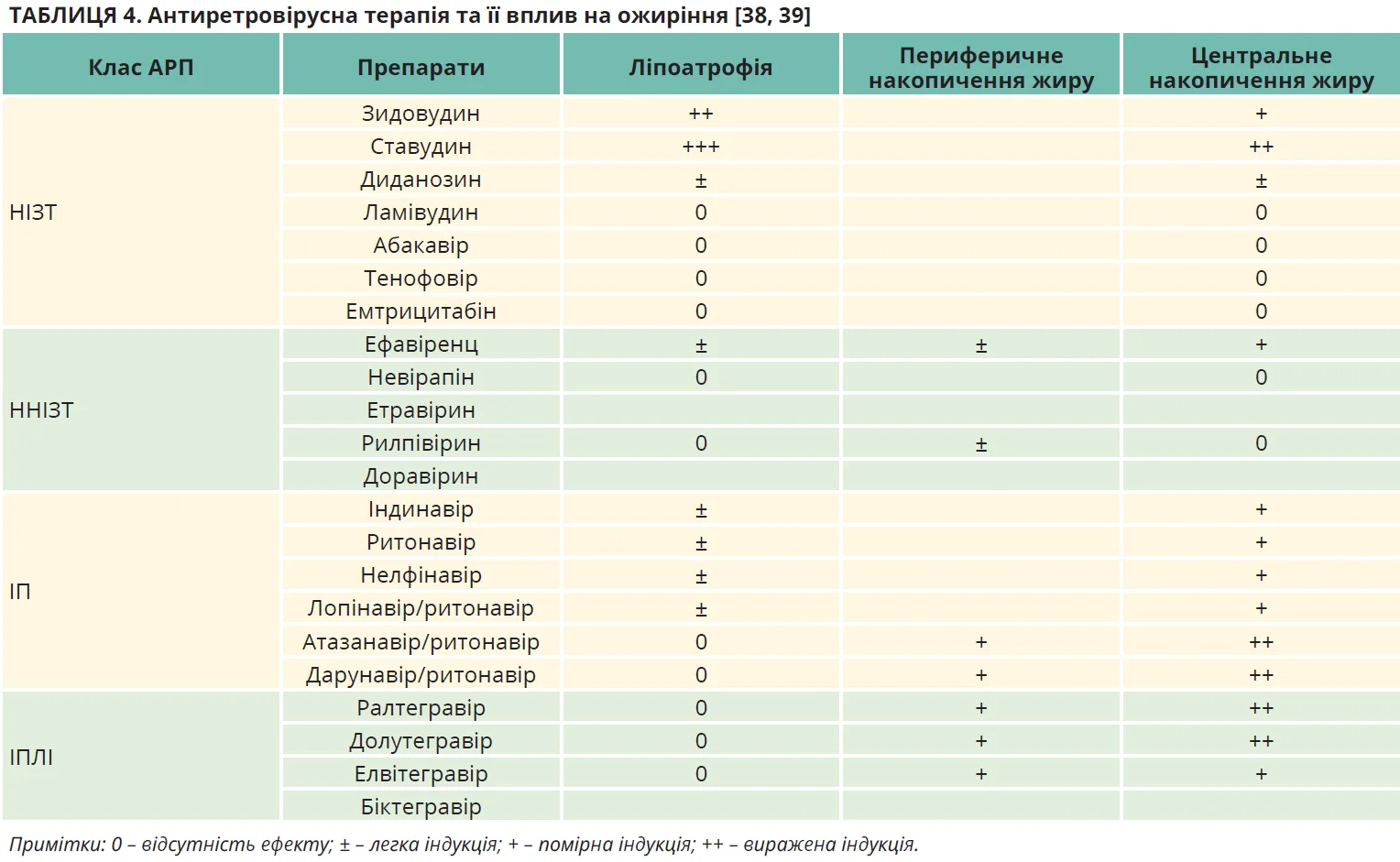 Клінічна картина. У ВІЛ-інфікованих осіб діабет зазвичай перебігає безсимптомно, тому після початку або модифікації АРТ варто проводити скринінг. Це особливо важливо для пацієнтів із групи ризику розвитку ЦД, зважаючи на їхнє походження, наявність ліподистрофії та склад обраного режиму АРТ (табл. 4) [38, 39].