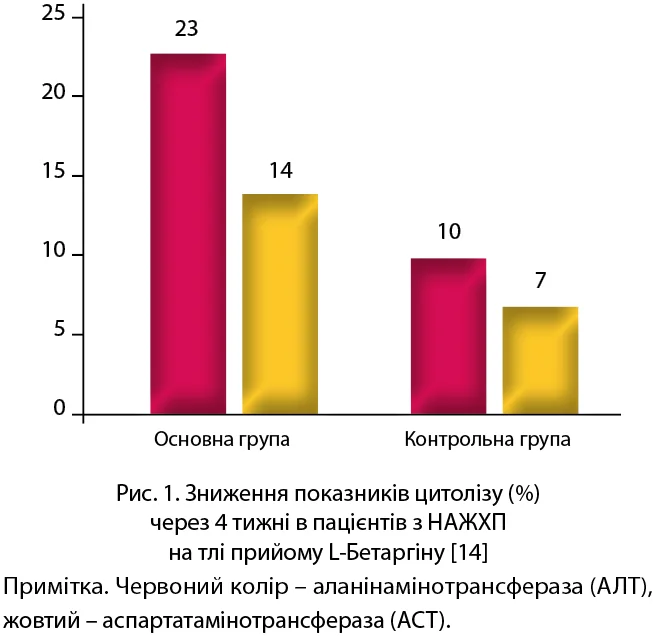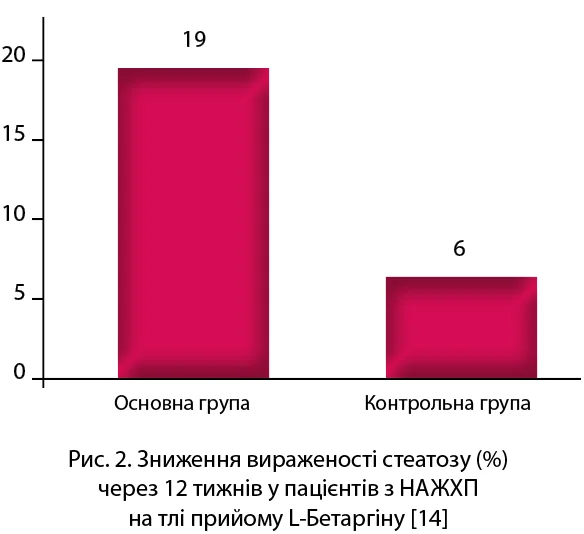 Ефективність застосування препарату L-Бетаргін у пацієнтів із ЦД та НАЖХП вивчено в численних дослідженнях. Зокрема, застосування L-Бетаргіну при НАЖХП протягом 12 тижнів (1 стік 3 рази на добу) сприяло статистично значущому пригніченню цитолізу, зменшенню ступеня стеатозу печінки, поліпшенню показників ліпідного обміну та швидкості портального кровотоку, а також зниженню ризику розвитку/прогресування атеросклерозу, серцево-судинних захворювань та інсулінорезистентності (рис. 1, 2) [14].