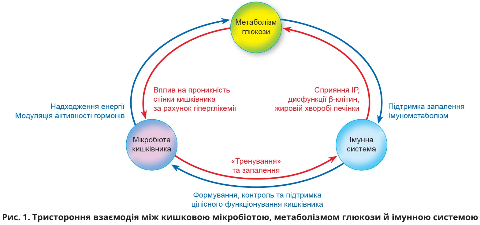 Протягом останніх декад одним із чинників розвитку ІР та її прогресування до ЦД 2 типу вважається хронічне метаболічне запалення низької інтенсивності, яке також називають метазапаленням [5]. Питання чинників, здатних запускати процеси метазапалення, продовжує вивчатися. Як один із цих чинників розглядається вплив кишкової мікробіоти, котра відіграє важливу роль у метаболізмі людини та виступає модулятором імунітету. Відомо, що ожирінню та ЦД 2 типу притаманні зміни складу мікробіоти кишківника [6-8]. Цей огляд присвячено тристоронній взаємодії між кишковою мікробіотою, імунною системою та шляхами метаболізму глюкози (рис. 1).