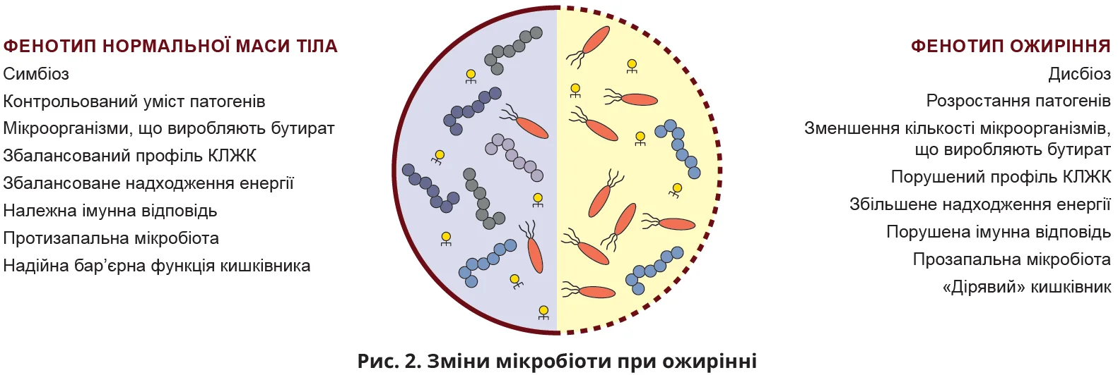 Хоча визначення здорової мікробіоти кишківника наразі відсутнє, деякі хвороби характеризуються відмінностями в мікробіоті порівняно зі здоровою групою контролю [29, 43]. Для опису цих відмінностей застосовується термін «дисбіоз», який відображає посилене розростання патобіонтів, втрату коменсалів та/або зменшення різноманітності бактерійного складу [44]. Пацієнтам з ожирінням і ЦД притаманні зміни складу мікробіоти порівняно зі здоровими людьми [6, 41, 45, 46] (рис. 2).