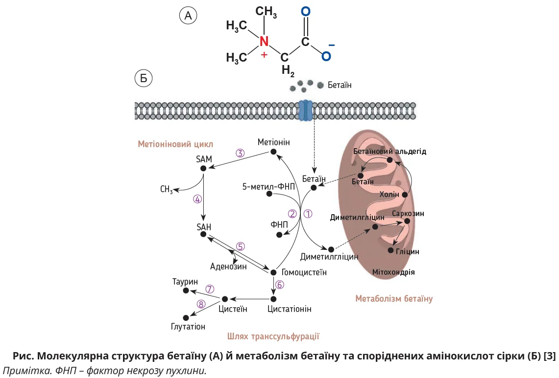 Бетаїн являє собою джерело метильних груп, що забезпечує процес трансметилювання в багатьох біохімічних шляхах [1]. Він є стабільною та нетоксичною природною речовиною. Оскільки бетаїн має структуру, схожу на таку гліцину, з трьома додатковими метильними групами, то його також називають триметилгліцином [3] (рис., А).