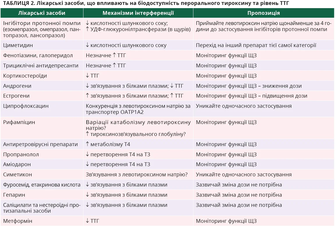Застосування препаратів, які взаємодіють та/або перешкоджають роботі різних лікарських форм левотироксину, може становити значну проблему при лікуванні пацієнтів у реальних умовах. Застосування певних медикаментів може знижувати біодоступність левотироксину, що потребує корекції дозування (табл. 2).