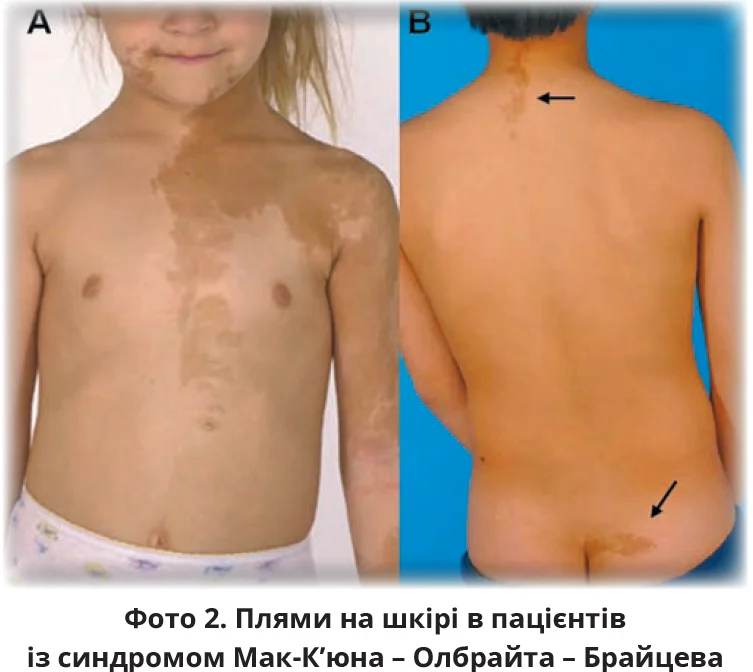 до 10-го тижня внутрішньоутробного розвитку. Клінічно проявляється множинними асиметричними плямами кольору кави з молоком на шкірі (з нерівними зубчатими краями, фото 2), поліосальною фіброзною дисплазією кісток і гіперфункцією ендокринних залоз (передчасне статеве дозрівання).