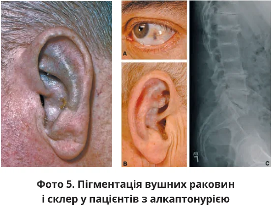 Візуально можуть виявлятися зміна кольору вушних раковин на сірий чи блакитний, зміна кольору долонь, ділянок під пахвами, носогубних складок, пігментація склер (фото 5).