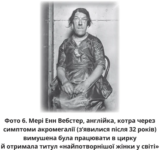 Акромегалія супроводжується непропорційним збільшенням (розширенням і потовщенням) кистей, підошов, черепа (м’яких тканин, носа, підборіддя, виличних кісток, надбрівних дуг) тощо (фото 6). Хворі постійно змінюють розмір каблучок, рукавичок, взуття. Шкіра потовщена, часто темного кольору, нижня щелепа та язик збільшені, міжзубні проміжки розширені. Грудна клітка має бочкоподібну форму. Відзначаються огрубіння голосу, зниження зору.