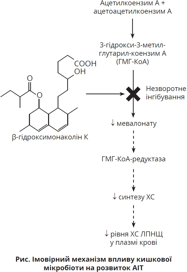 Відповідно, добавки на основі червоного ферментованого рису мають досить високі рівень і клас доказовості. Механізм дії цих добавок полягає в тому, що основні активні речовини червоного рису – монаколіни – зворотно інгібують 3-гідрокси-3-метил-глутарил-коензим А (ГМГ-КоА) редуктазу, ключовий фермент синтезу ХС (рис.), тобто мають механізм дії, аналогічний статинам.