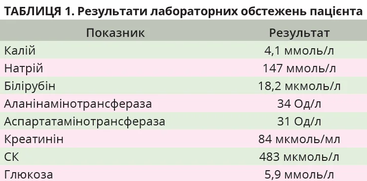 Зважаючи на підвищений рівень СК, пацієнту було оптимізовано антигіпертензивну терапію. Фіксовану комбінацію периндоприл/індапамід замінено на фіксовану комбінацію периндоприл/амлодипін.