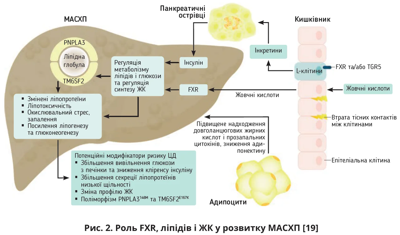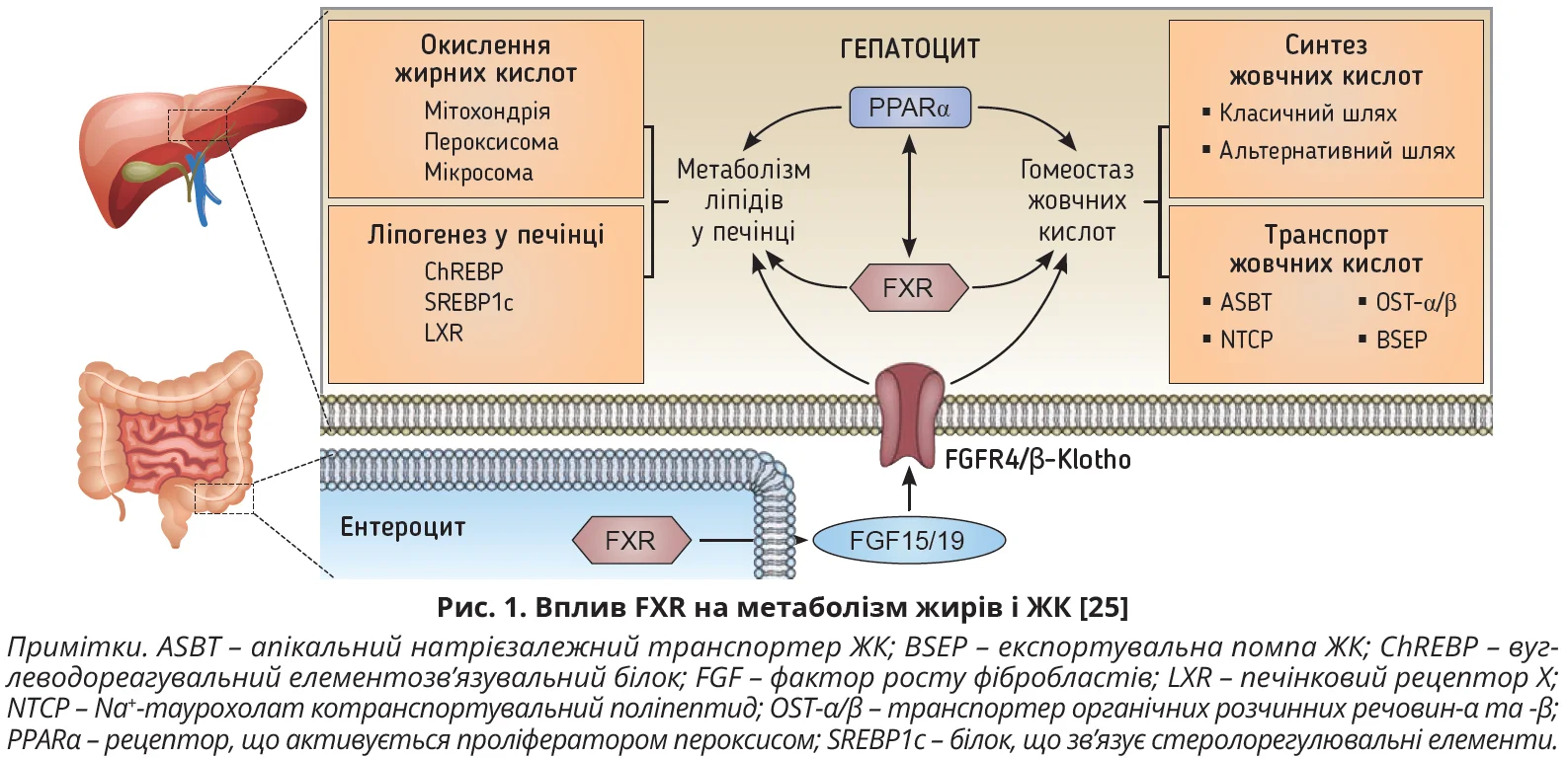 Фактично FXR являє собою сигнальний шлях, який з’єднує печінку, тонку кишку, жирову тканину та підшлункову залозу; FXR відіграє важливу роль у координації гомеостазу ЖК, ентерогепатичній циркуляції, обміні ліпідів, адже FXR не тільки регулює експресію генів, які відповідають за синтез ЖК та ліпідів de novo, а й контролює циркуляцію ЖК, впливаючи на специфічні білки-транспортери. Зниження експресії FXR зафіксовано при різноманітній гепатологічній патології: СХП, фіброзі та цирозі печінки, гепатоцелюлярній карциномі, медикаментозно-індукованому ураженні печінки [6].