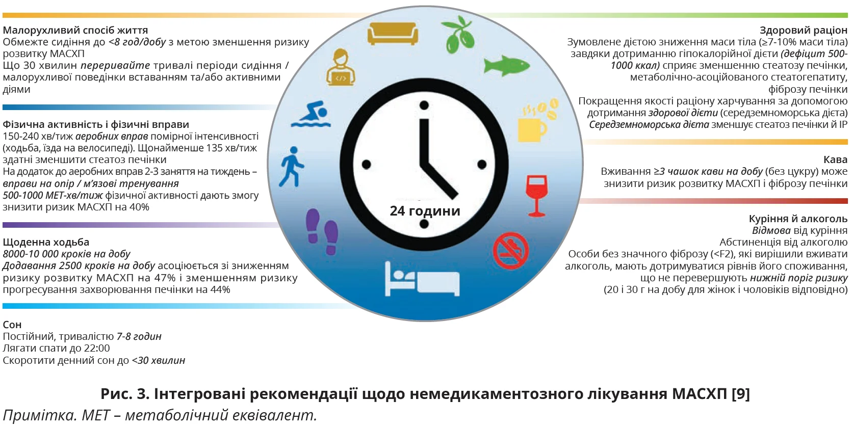 Провідними модифікованими факторами ризику МАСХП визнано малорухливий спосіб життя, переїдання, куріння, вживання алкоголю, надлишкова маса тіла / ожиріння, гіперглікемія натще [19]. Доведено, що МАСХП посилює явища ІР, як периферичної, так і внутрішньопечінкової, збільшує схильність до розвитку атерогенної дисліпідемії та спричиняє вивільнення системних прозапальних цитокінів і гепатокінів [19]. Саме тому наріжним каменем лікування МАСХП є рекомендації щодо корекції способу життя, котрі стосуються нормалізації дієти та заохочення до збільшення фізичної активності (рис. 3).