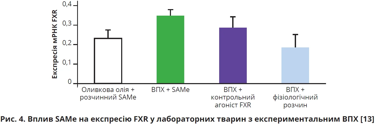 Нещодавно представлено експериментально обґрунтовані дані щодо наявності в SAMе здатності стимулювати FXR. Цікаві результати представили автори експериментальної роботи, в якій щурам лінії Sprague Dawley з α-нафтилізотіоціанат-індукованим внутрішньопечінковим холестазом (ВПХ) уводили SAMе (60 мг/кг) і досліджували рівень експресії FXR, BSEP, NTCP та білка, асоційованого з численною лікарською резистентністю (Mrp2) [13]. Тварин розподілили на декілька груп, у яких застосовували різноманітні способи контролю ефективності SAMе: таким чином створили групи «оливкова олія + розчинний SAMе», «ВПХ + SAMе», «ВПХ + контрольний агоніст FXR», «ВПХ + фізіологічний розчин». Застосування SAMе сприяло нівелюванню клініко-лабораторних ознак цитолізу, ВПХ та пом’якшенню дисліпідемії, а також забезпечувало вірогідне зростання експресії FXR, BSEP, NTCP, Mrp2 (рис. 4). Зазначені зміни супроводжувалися покращенням гістологічного стану печінки [13].