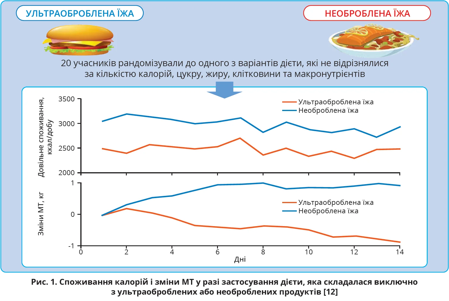 Сучасна дієта включає значну кількість насичених жирів, цукру та солі, що значно перевищує рекомендовану добову норму для жінок у 1800 кал. Отож, якщо жінка не регулює споживання калорій та/або має низьку фізичну активність, виникає стан позитивного енергетичного балансу та збільшення МТ. Популярність ультраобробленої їжі пояснює пандемію ожиріння у світі [11]. У 2019 р. проведено цікаве рандомізоване контрольоване дослідження, фінансоване Національним інститутом охорони здоров’я США. Двадцять дорослих забезпечено триразовим харчуванням і перекусами, які цілковито складалися або з ультраоброблених, або з необроблених продуктів з однаковою кількістю калорій, макроелементів, клітковини, натрію та цукру. Впродовж 2 тижнів учасникам дозволялося їсти будь-яку кількість їжі, після чого дієту в групах міняли на наступні 2 тижні. Виявилося, що учасники, які вживали ультраоброблені продукти, споживали ≈500 додаткових калорій щодня порівняно з тими, котрі їли необроблену їжу, та набрали в середньому 1 кг МТ (рис. 1). За наступні 2 тижні учасники, які споживали необроблені продукти, втратили попередньо набрану МТ.