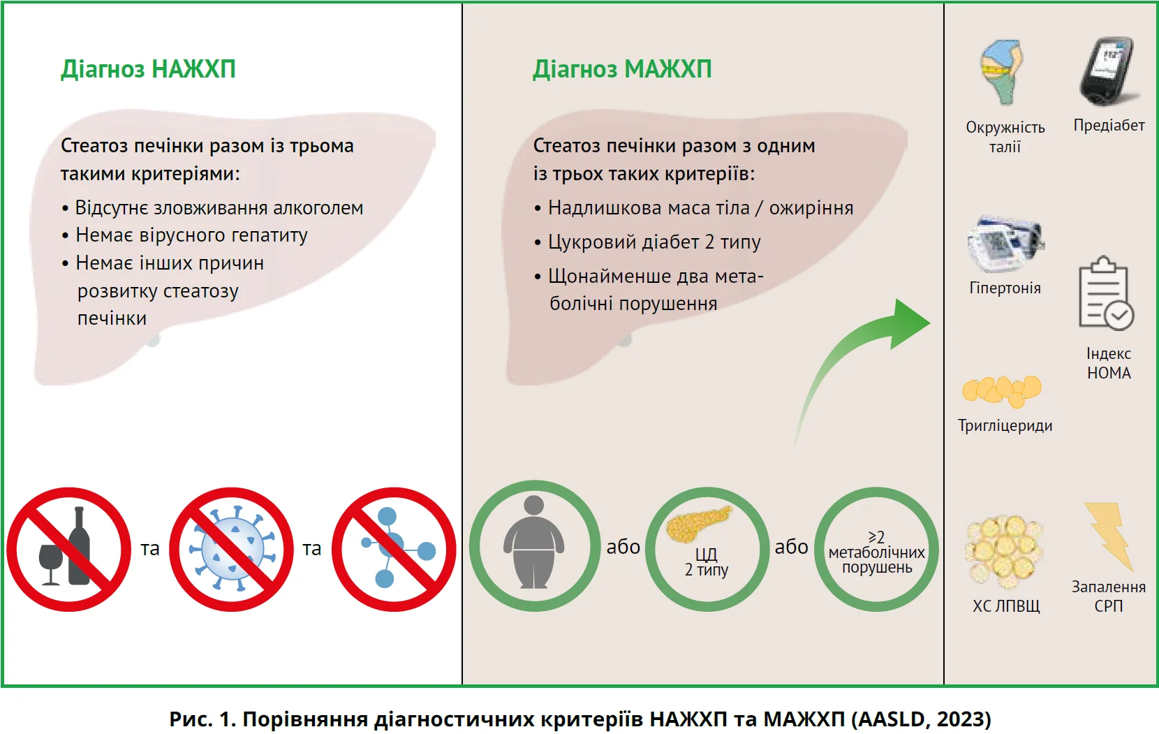 Зважаючи на тісний зв’язок НАЖХП із такими етіологічними чинниками, як ожиріння, метаболічний синдром і цукровий діабет (ЦД) 2 типу, прогнозоване зростання поширеності цих метаболічних захворювань супроводжуватиметься збільшенням захворюваності на НАЖХП. У зв’язку із цим 2020 року міжнародна група експертів із 22 країн запропонувала змінити термін «НАЖХП» і модифікувати дефініцію захворювання на таку, що точніше відображає патогенез (Eslam M. et al., 2020). Так з’явився новий термін – метаболічна дисфункція, асоційована із жировою хворобою печінки (МАЖХП), яку пропонується діагностувати за одночасного виявлення надлишкової ваги / ожиріння, або ЦД, або ознак метаболічної дисфункції (Eslam M. et al., 2020). Зазначена семантична модифікація не лише вплинула на формулювання захворювання, торкнулася діагностичних алгоритмів, а й сколихнула хвилю обговорень щодо оптимального лікування НАЖХП/МАЖХП.