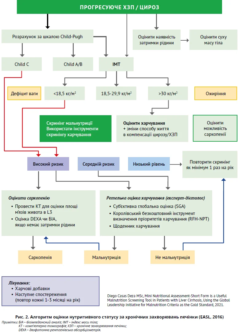 Рекомендації EASL (2016) передбачають проведення обов’язкового та додаткового лабораторного обстеження з метою уточнення функціонального стану печінки й виключення рідкісних захворювань (хвороба Вілсона – Коновалова, автоімунна патологія, дефіцит α1-антитрипсину). Інша нещодавно опублікована настанова EASL (2021) рекомендує гастроентерологам обов’язково проводити скринінг мальнутриції (недостатнього харчування) за хронічних захворювань печінки (рис. 2).