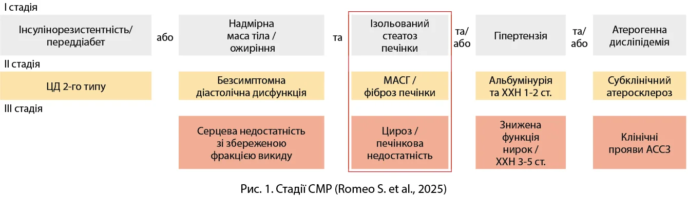 Відкрила зустріч Любов Костянтинівна Соколова, докторка медичних наук, старша наукова співробітниця, завідувачка відділу діабетології ДУ «Інститут ендокринології та обміну речовин ім. В.П. Комісаренка НАМН України». Вона наголосила на активному обговоренні проблеми системного метаболічного розладу (СМР), який став парадигмою сучасного життя. Практично в кожного пацієнта спостерігаються певні складові СМР, урахування котрих допомагає обрати найоптимальнішу персоніфіковану терапію. Цей термін запропоновано консенсусом Європейського товариства з вивчення атеросклерозу (Romeo S. et al., 2025). СМР охоплює сукупність метаболічних порушень, які вражають декілька органів і призводять до підвищеної захворюваності та смертності як від серцево-судинних захворювань (ССЗ), так і від інших причин. Етіологія СМР гетерогенна, з різноманітними, хоча й схожими за наслідками патогенетичними механізмами, які прогресують, формуючи згубне коло, що ускладнює ідентифікацію початкових причин хвороби та перешкоджає комплексному підходу до профілактики. Початок СМР можуть зумовлювати різні етіопатогенетичні чинники, які визначаються генетичною вразливістю окремих органів до нездорового харчування та малорухливого способу життя. Поступове порушення метаболічного гомеостазу на рівні кількох органів запускає прогресування СМР, який перетворюється на відносно дедиференційований розлад з накопиченням численних супутніх захворювань. Розрізняють три стадії СМР: I стадія визначається як наявність ізольованих а) інсулінорезистентності/переддіабету чи б) надмірної маси тіла / дисфункціонального ожиріння та принаймні однієї з таких ознак: ізольований стеатоз печінки, гіпертензія або атерогенна дисліпідемія; ІІ стадія визначається як ЦД 2-го типу, безсимптомна діастолічна дисфункція, метаболічно-асоційований стеатогепатит (МАСГ) / фіброз печінки, альбумінурія та хронічна хвороба нирок (ХХН) 1-2 ст., субклінічний атеросклероз без подій в анамнезі; ІІІ стадія визначається як симптоматична серцева недостатність зі збереженою фракцією викиду (СНзбФВ), цироз печінки або печінкова недостатність, знижена функція нирок / ХХН 3-5 ст., клінічний прояв атеросклеротичних ССЗ (АССЗ) (рис. 1).