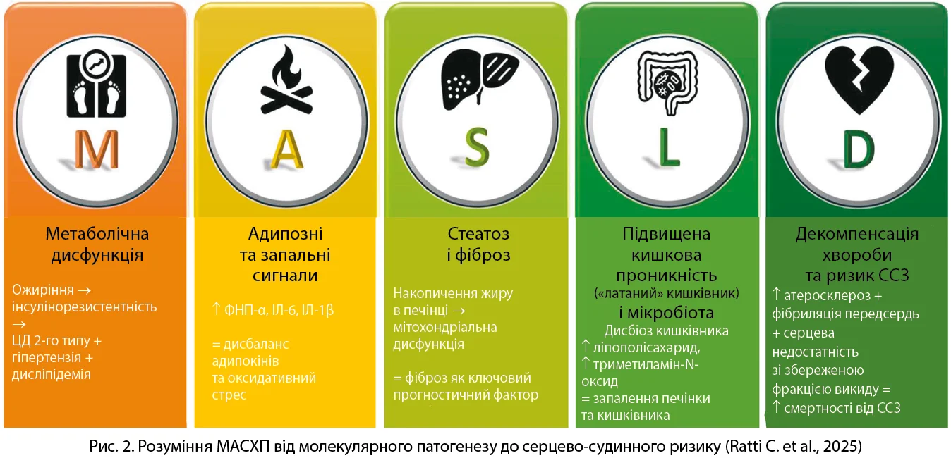 Ба більше, абревіатура МАСХП (англ. MASLD – metabolic dysfunction-associated steatotic liver disease) підсумовує багатосистемну патофізіологію, яка пов’язує метаболічне захворювання печінки із серцево-судинним ризиком (рис. 2). Метаболічна дисфункція ініціює стеатоз печінки. Адипозапалення, тобто запалення, спричинене жировою тканиною, й оксидативний стрес зумовлюють прогресування стеатозу, що переростає у фіброз печінки – ключовий прогностичний маркер. Синдром підвищеної кишкової проникності та дисбактеріоз посилюють ураження печінки й судин. Прогресування хвороби призводить до атеросклерозу, СНзбФВ та серцево-судинних подій. Ця інтегративна модель підкреслює необхідність міждисциплінарної допомоги та раннього оцінювання кардіометаболічного ризику в пацієнтів з МАСХП (Ratti C. et al., 2025).