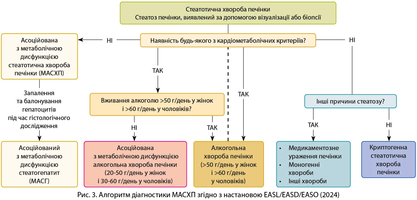Діагноз МАСХП установлюється після виявлення стеатозу печінки методом візуалізації, за наявності будь-яких кардіометаболічних критеріїв і за відсутності надмірного вживання алкоголю або інших причин стеатозу печінки (рис. 3).