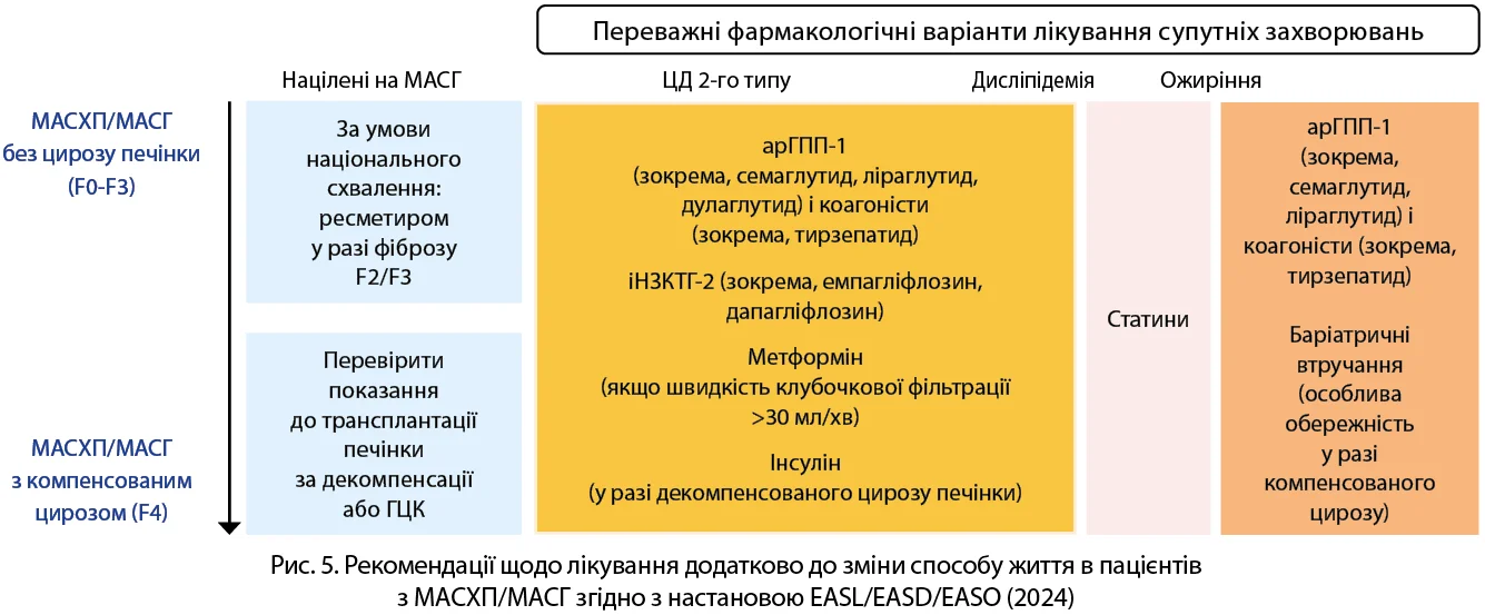 Настанови акцентують на важливості адекватного лікування супутніх захворювань, які асоціюються з МАСХП, – ЦД 2-го типу, дисліпідемії й ожиріння. Пріоритетними засобами для лікування ЦД 2-го типу в пацієнтів з МАСХП є агоністи рецепторів глюкагоноподібного пептиду-1 (арГПП-1) та інгібітори натрієзалежного котранспортера глюкози 2-го типу (іНЗКТГ-2), які демонструють певні переваги щодо покращення печінкових, метаболічних і серцево-судинних наслідків (рис. 5). Для корекції дисліпідемії пріоритетними залишаються статини, котрі, як відомо, можуть підвищувати рівні трансаміназ, тому їх застосування в пацієнтів з МАСГ часто проблематичне.