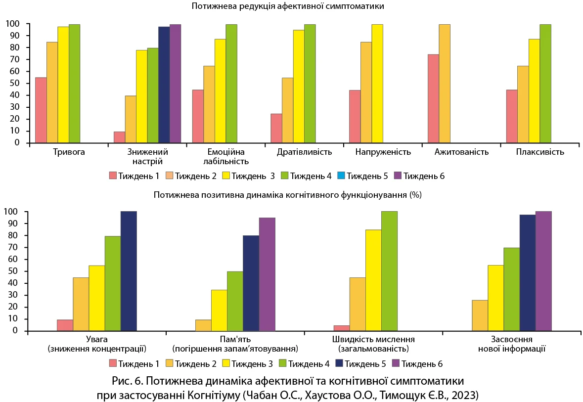 Дослідження, проведене О.С. Чабаном та О.О. Хаустовою (2023), продемонструвало, що застосування Когнітіуму протягом 60 днів у пацієнтів із хронічними соматичними хворобами сприяло зниженню симптомів тривожності та депресії вже на 7-й день лікування; крім того, спостерігалося покращення когнітивних функцій – пам’яті, уваги, швидкості мислення й засвоєння нової інформації (рис. 6).