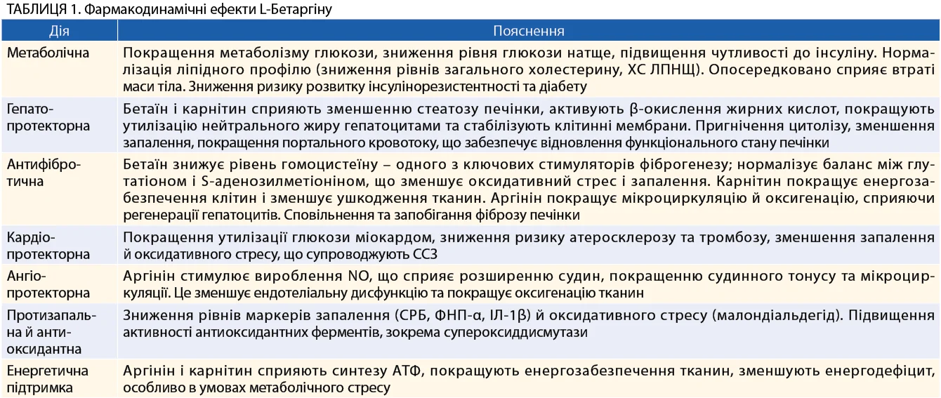 Антифібротична дія L-Бетаргіну пояснюється синергічним впливом його компонентів на ключові патогенетичні механізми фіброзу печінки при МАСХП і метаболічному синдромі. Зокрема, бетаїн знижує рівень гомоцистеїну – амінокислоти, яка стимулює фіброгенез, а також нормалізує метаболічний баланс між глутатіоном і S-аденозилметіоніном, що сприяє зменшенню оксидативного стресу та запалення. Він також стабілізує мембрани гепатоцитів і зменшує стеатоз, що запобігає переходу жирової інфільтрації у фібротичні зміни. L-карнітин покращує мітохондріальну функцію, знижує накопичення токсичних ліпідів і забезпечує енергетичну підтримку клітин, що зменшує ушкодження печінкової тканини та пригнічує фіброгенез. Аргініну цитрат покращує мікроциркуляцію й оксигенацію тканин, забезпечує регенерацію гепатоцитів і знижує ендотеліальну дисфункцію – чинник, який супроводжує прогресування фіброзу. Завдяки цим механізмам L-Бетаргін® сприяє зменшенню фібротичних змін у печінці, покращує її функціональний стан і знижує ризик переходу МАСХП у МАСГ або цироз. Фармакодинамічні ефекти L-Бетаргіну підсумовує таблиця 1.