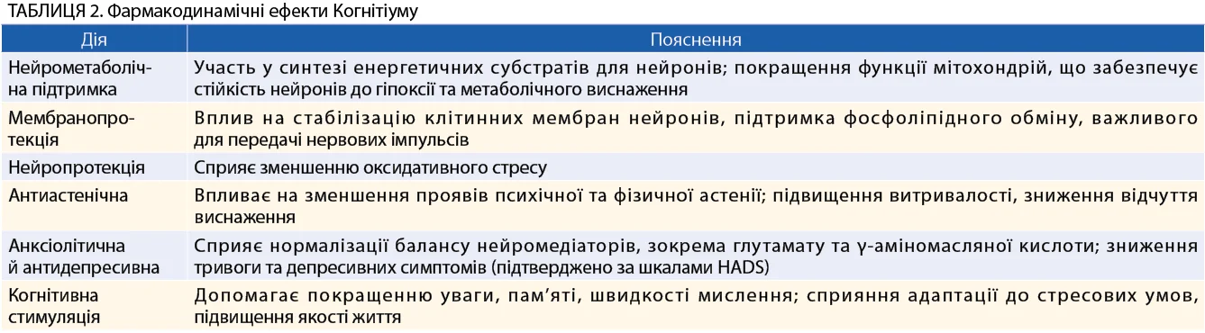 N-ацетил-L-аспарагінова кислота має комплексний метаболічний вплив на нервову систему, що сприяє корекції емоційно-когнітивних порушень у пацієнтів із хронічними соматичними хворобами в умовах перманентного стресу (Чабан О.С., Хаустова О.О., 2023). Механізми дії охоплюють відновлення нейромедіаторної регуляції, стабілізацію церебрального метаболізму, зменшення проявів тривоги, астенії та когнітивного виснаження. N-ацетил-L-аспарагінова кислота впливає на кальцієвий гомеостаз у нейронах, зокрема регулює внутрішньоклітинний обмін іонів кальцію (Ca2+), що є критично важливим для синаптичної передачі, нейропластичності, захисту нейронів від індукованої глутаматом ексайтотоксичності; стабілізує кальцієві канали, що сприяє зниженню нейрональної гіперзбудливості – важливого механізму при тривожних і астенічних розладах; опосередковано знижує рівень індукованого стресом нейрозапалення, котре часто супроводжується порушенням кальцієвого обміну. Фармакодинамічні ефекти Когнітіуму підсумовує таблиця 2.