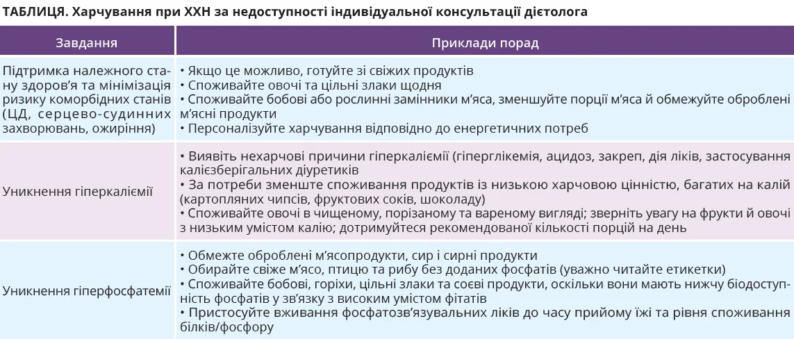 Якщо лікарю недоступна співпраця з дієтологом, який складає індивідуалізовані плани раціону, варто надати пацієнту загальні поради щодо здорового харчування при ХХН (табл.).
