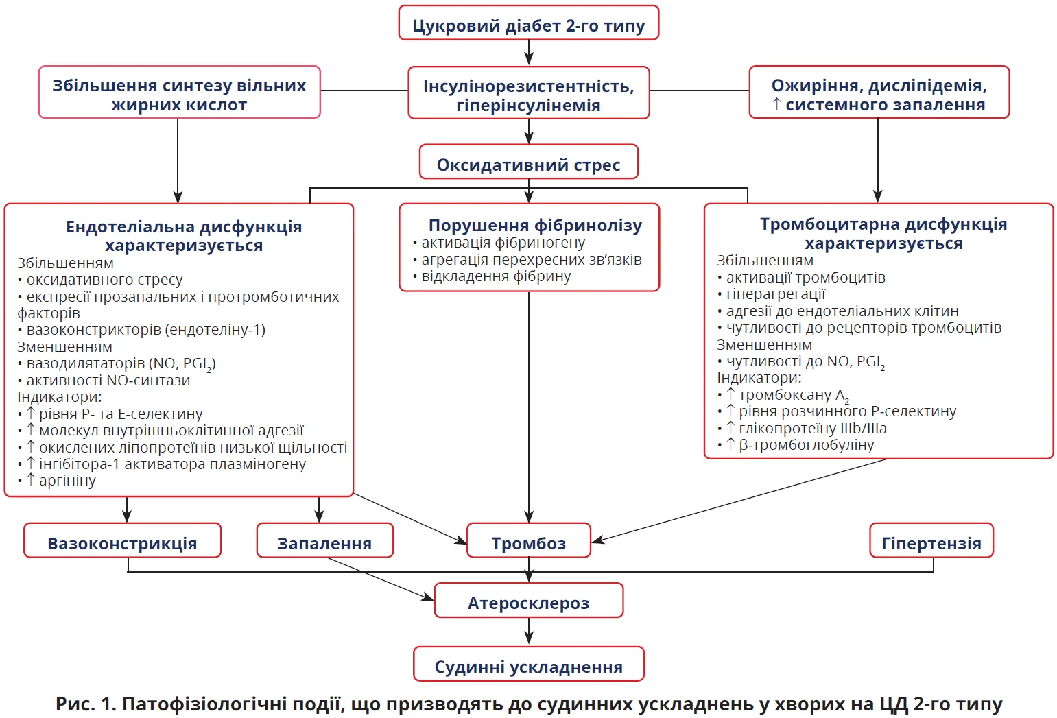 На особливу увагу заслуговують судинні ускладнення ЦД. Від ССЗ (діабетичної макроангіопатії) помирають 8 із 10 пацієнтів. Смертність від гострого порушення мозкового кровообігу в пацієнтів із ЦД у 2-4 рази вища, ніж в осіб без ЦД. Що стосується діабетичних мікроангіопатій, то ретинопатія є основною причиною сліпоти в дорослих працездатного віку, хронічна хвороба нирок (ХХН) діабетичного генезу (діабетична нефропатія) – основною причиною термінальної ниркової недостатності, нейропатія – основною причиною нетравматичних ампутацій нижніх кінцівок. У разі ЦД 1-го типу впродовж перших 5 років посилюються запалення, синтез колагену та позаклітинного матриксу, зменшується щільність капілярів. Через кілька років після виникнення ЦД спостерігаються тяжка ендотеліальна дисфункція й атеросклеротичні макроваскулярні ускладнення, що зумовлені ураженням органів- мішеней: інфаркт міокарда (ІМ), серцева недостатність (СН), захворювання периферичних артерій (ЗПА), транзиторні ішемічні атаки або інсульт, тяжка протеїнурія та термінальна стадія ниркової недостатності. При ЦД 2-го типу ССЗ насамперед зумовлені дисфункцією ендотелію (ДЕ) й негативним впливом гіперглікемії, інсулінорезистентності та дисліпідемії. За інсулінорезистентності виникає ціла низка коморбідних станів, які, крім відомих компонентів метаболічного синдрому (ожиріння, АГ, дисліпідемія, гіперглікемія), включають також запалення, нервову дегенерацію, автономну дисфункцію, стеатотичну хворобу печінки, що асоційована з метаболічною дисфункцією, й обструктивне апное уві сні.