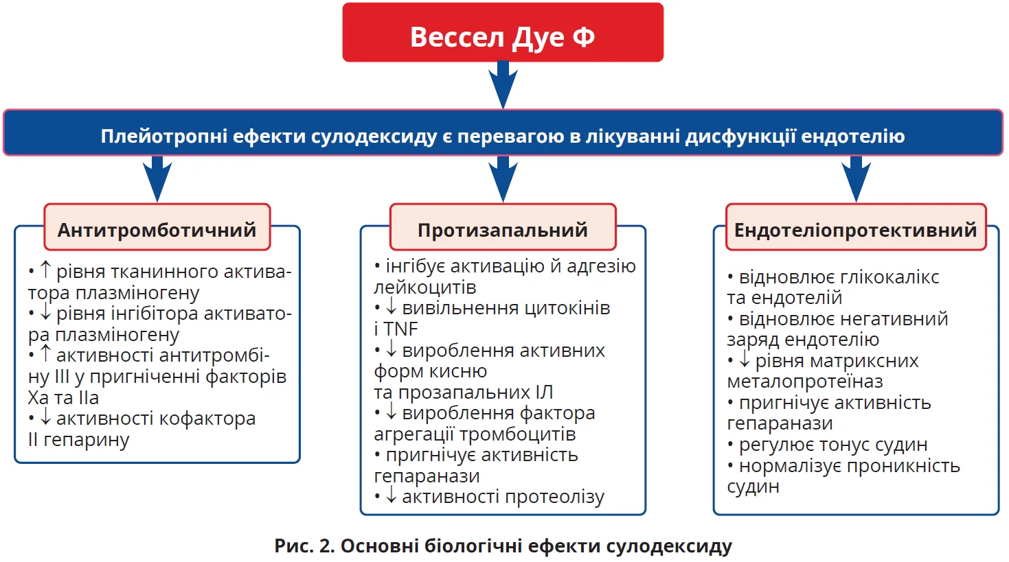 Варто підкреслити негативний вплив гіперглікемії на глікокалікс, що особливо важливо в пацієнтів із ЦД. Зокрема, 6-годинний вплив гострої гіперглікемії 16 ммоль/л істотно зменшує об’єм глікокаліксу навіть у здорових добровольців (Gouverneur M. et al., 2006). Захисний вплив на глікокалікс та ендотелій у багатьох дослідженнях, у тому числі при ЦД, продемонстрував сулодексид – природна суміш глікозаміногліканів, що заміщує втрачені глікозаміноглікани в глікокаліксі та відновлює природний шар ендотеліальних клітин і електронегативний заряд судинної стінки, сприяючи правильному функціонуванню ендотелію. Через 8 тижнів терапії сулодексидом спостерігалися значуще збільшення товщини ендотеліального глікокаліксу та зменшення проникності судин як у здорових добровольців, так і в пацієнтів із ЦД 2-го типу (Broekhuizen L. et al., 2010). Тож основні біологічні ефекти сулодексиду – захист і відновлення ендотелію, антитромботична та протизапальна дії – дають змогу впливати на головні ланки патогенезу діабетичного ураження судин (рис. 2) (Carroll B. et al., 2019).