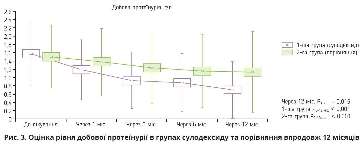 І.О. Дудар продемонструвала результати власних досліджень, які вивчали особливості нефропротективного впливу сулодексиду у хворих на діабетичну нефропатію (рис. 3). Через 12 місяців лікування сулодексидом спостерігалося значуще зниження добової протеїнурії (р<0,001). Якщо порівнювати річну динаміку добової протеїнурії, то в пацієнтів із ХХН ІІ стадії на тлі лікування сулодексидом відбулося зменшення протеїнурії на 1 г/добу проти 0,4 г/добу в групі порівняння (р<0,001); у пацієнтів із ХХН ІІІ стадії показники протеїнурії в указаних групах зменшилися на 0,8 та 0,4 г/добу відповідно (р=0,001). Збільшення ШКФ під впливом сулодексиду спостерігалося вже через 1 місяць після початку лікування. Через 3 місяці лікування сулодексидом спостерігалося значуще зменшення рівнів інтерлейкіну-1β (ІЛ-1β) й інтерферону-γ; натомість рівень ІЛ-10 значуще підвищився, внаслідок чого суттєво знизилося співвідношення інтерферон-γ/ІЛ-10 (Лобода О.М. та ін., 2009; Тopchiy I. et al., 2017).