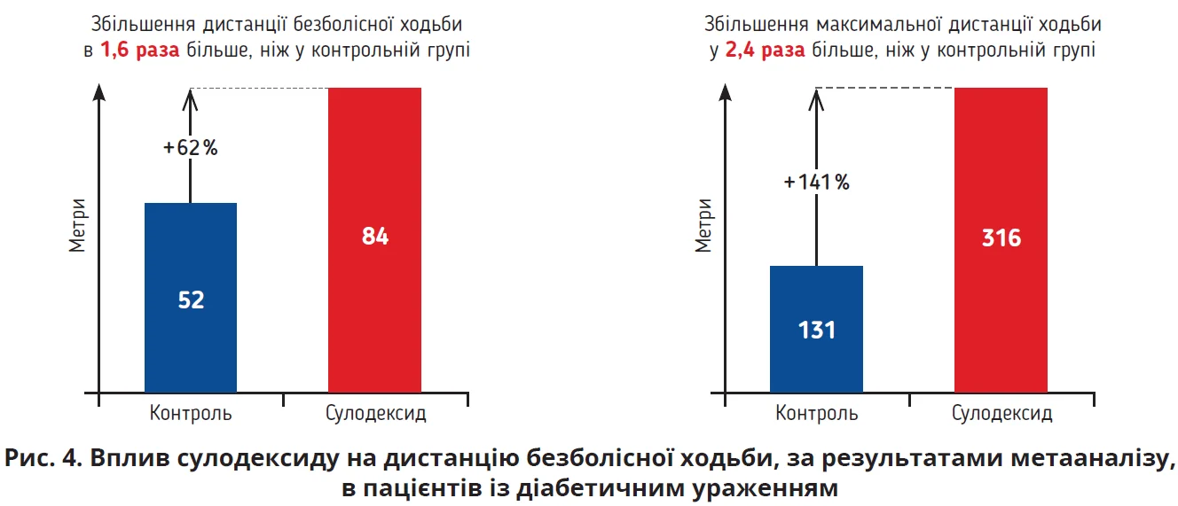 Що стосується проблеми периферичного атеросклерозу, то 16% людей віком ≥55 років мають атеросклероз артерій нижніх кінцівок. Окрім віку, чинниками ризику цього стану є куріння та діабет. Понад 50% пацієнтів не мають симптомів, понад 60% пацієнтів мають атеросклероз інших судинних басейнів. Цій когорті рекомендовано антитромбоцитарну терапію. Проте, незважаючи на прийом ацетилсаліцилової кислоти, ризик ІМ, інсульту чи раптової смерті залишається високим – до 9% на рік. За результатами останніх метааналізів, у пацієнтів із діабетичним ураженням периферичних артерій у групі лікування сулодексидом дистанція безболісної ходьби збільшилася в середньому на 84 метри, тобто в 1,6 раза порівняно з контрольною групою; максимальна дистанція ходьби збільшилася в середньому на 316 метрів, тобто у 2,4 раза порівняно з групою контролю (рис. 4); загоєння діабет-асоційованих трофічних виразок відзначалося в середньому на 27 днів раніше, ніж у групі контролю (Bignamini A., 2021; Gaddi A.V. et al., 2020).