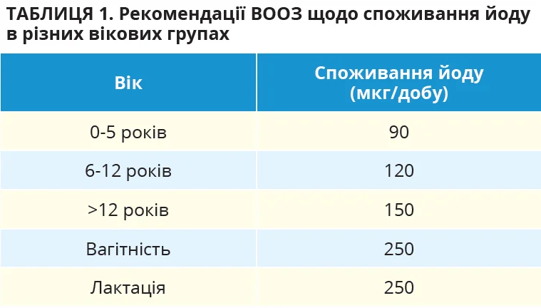 Йод відіграє ключову роль у функціонуванні органів і тканин, регулюючи загальний метаболізм через тиреоїдні гормони. Він також є критично важливим для розвитку нервової системи плода та дитини. У зв’язку з цим особливе значення має достатнє споживання йоду під час вагітності та лактації, а також у ранньому дитинстві. Рекомендовані Всесвітньою організацією охорони здоров’я (ВООЗ) норми добового споживання йоду для різних вікових груп наведено в таблиці 1.