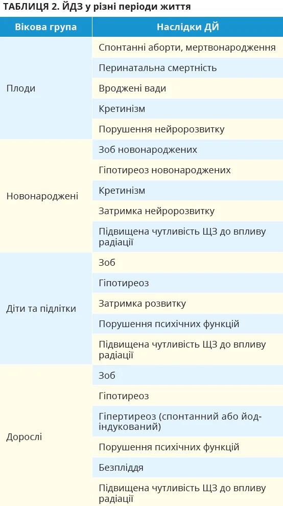 ДЙ спричиняє широкий спектр ЙДЗ, які мають різні прояви в кожній віковій групі (табл. 2). Наприклад, у дорослих ДЙ асоціюється із зобом, вузловими утвореннями в ЩЗ та порушеннями її функції. У регіонах із тяжким дефіцитом йоду ДЙ є основною причиною гіпотиреозу. У плода та новонароджених ДЙ спричиняє не лише зоб і гіпотиреоз, а й серйозні порушення розвитку нервової системи. ВООЗ називає ДЙ найважливішою з усіх причин ураження мозку, яким можна запобігти.