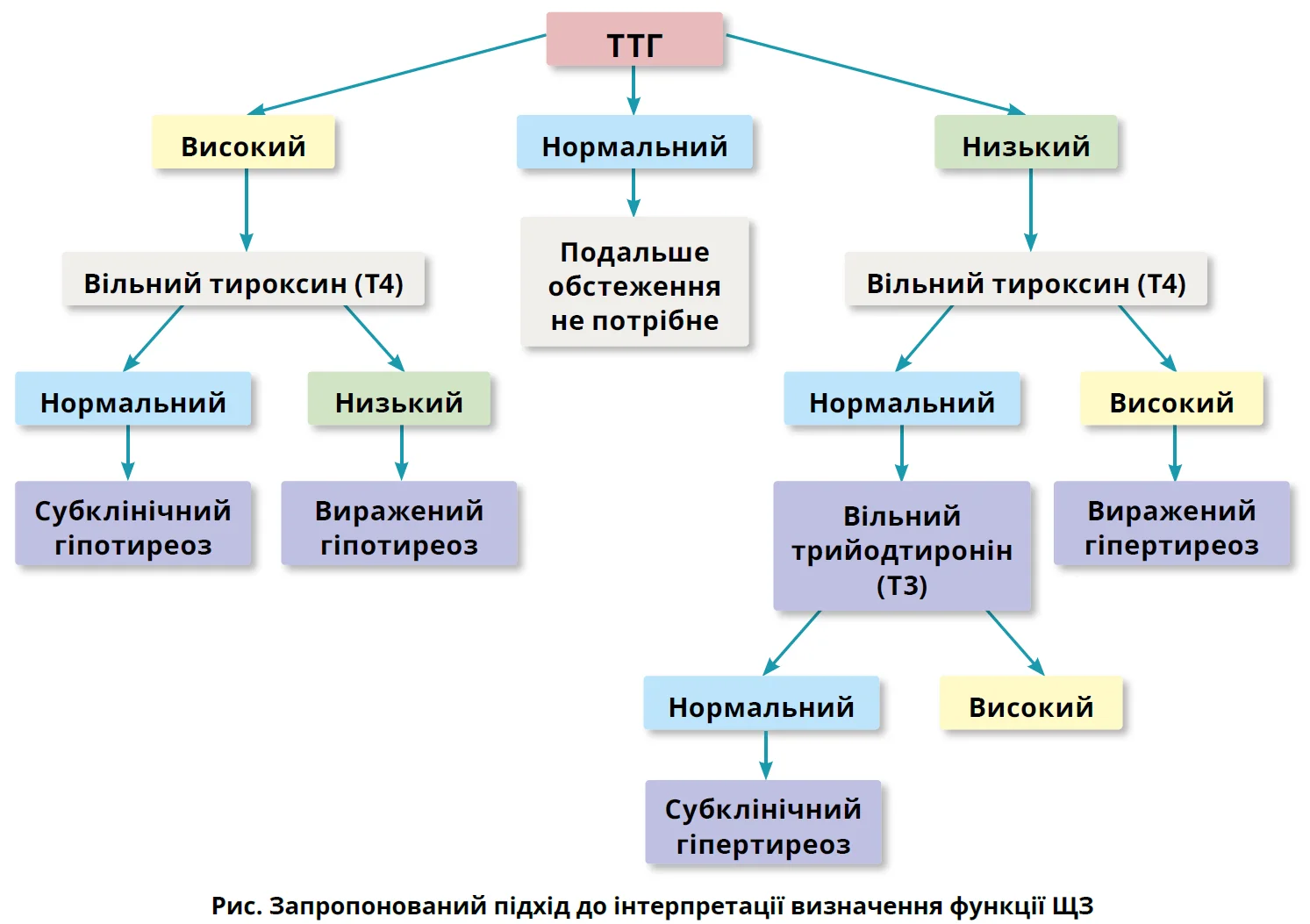 Виражена дисфункція ЩЗ, окрім змін ТТГ, характеризується відхиленням від норми рівня тиреоїдних гормонів: тироксину (T4) та трийодтироніну (T3). Така картина трапляється набагато рідше, ніж аномальний рівень ТТГ у сполученні з нормальними рівнями гормонів ЩЗ, який часто вважають свідченням субклінічних захворювань ЩЗ (рис.) [3, 4].