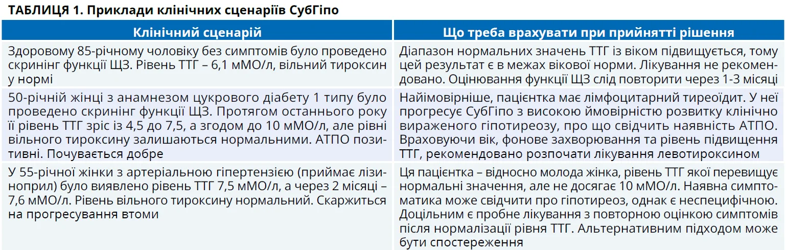 Оскільки СубГіпо являє собою субтотальний дефіцит гормонів ЩЗ, повноцінна доза замісної гормонотерапії (1,6 мг/кг/добу) може бути занадто великою. Натомість слід розпочати з дози 25-75 мг/день, особливо в осіб віком понад 65 років або з чинниками ризику ССЗ [2, 53]. Дозу потрібно коригувати на основі ТТГ 1 раз на 6-8 тижнів; цільовим рівнем ТТГ є досягнення показника в діапазоні референсних значень [24, 53]. Проте слід пам’ятати, що нормальні сироваткові рівні ТТГ у старшій популяції можуть бути дещо вищими, тому у віковій групі понад 70-80 років цільовим рівнем ТТГ можна вважати 4-6 мМО/л [53]. Приклади клінічних сценаріїв СубГіпо наведено в таблиці 1.