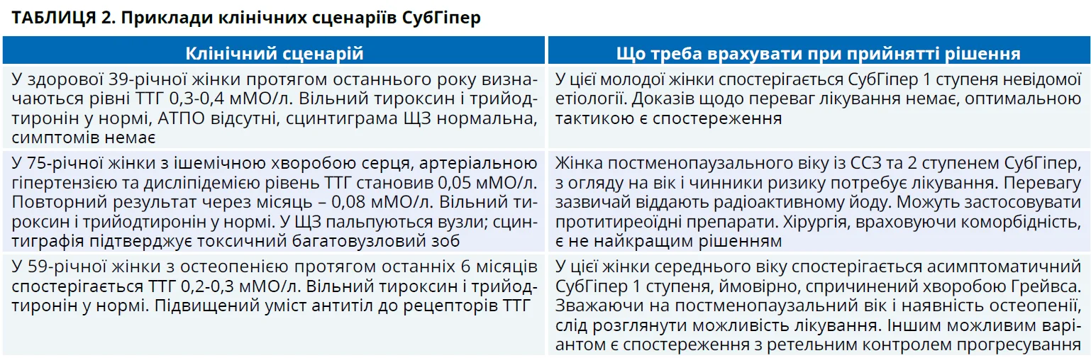 Якісна доказова база щодо сприятливих впливів лікування СубГіпер на описані вище наслідки відсутня, тому рекомендації ґрунтуються на експертній думці та є дуже схожими між собою [8, 11, 57, 65]. Якщо рівень ТТГ є стійко нижчим за 0,1 мМО/л, лікування рекомендовано особам віком менш як 65 років і пацієнтам із високим ризиком ускладнень (остеопорозу, аритмій і ССЗ). Для пацієнтів віком менш як 65 років без симптомів або чинників ризику зі стійким зниженням ТТГ до <0,1 мМО/л лікарям запропоновано приймати рішення на власний розсуд. У осіб віком ≥65 років і пацієнтів із чинниками ризику при стійкому рівні ТТГ у межах від 0,1 мМО/л і нижньою межею норми експертні думки здебільшого свідчать на користь лікування. Натомість для асимптоматичних осіб віком менш як 65 років з аналогічним рівнем ТТГ прийнятним є спостереження.