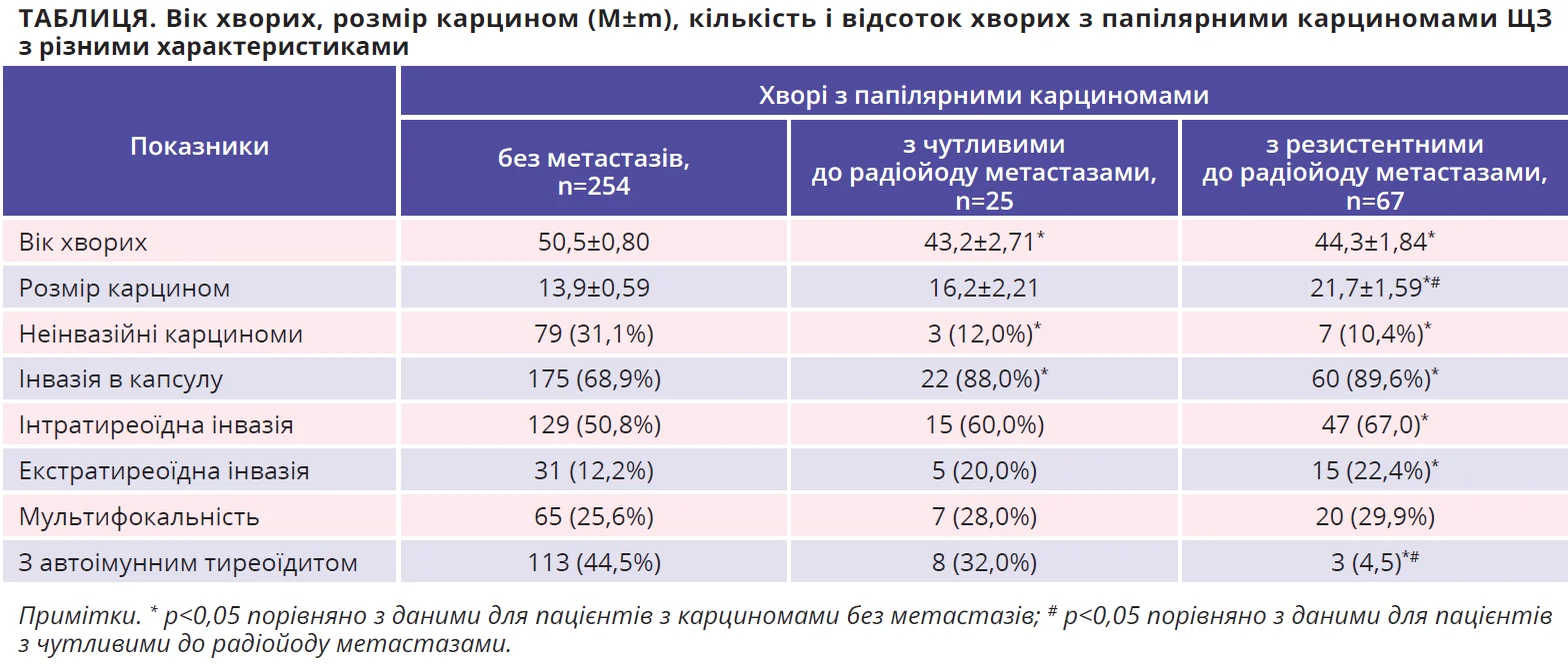 Результати проведених нами досліджень указують на відсутність чітких і специфічних прогностичних доопераційних чинників виникнення саме радіойодрезистентних метастазів, за винятком хіба що розміру карциноми та наявності хронічного автоімунного тиреоїдиту в ЩЗ, які можна певною мірою оцінити за даними доопераційного ультразвукового дослідження (табл.).