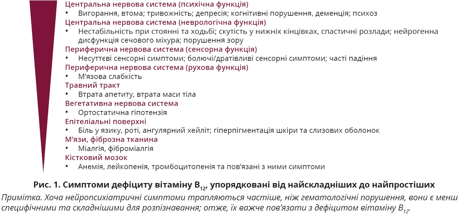 Дефіцит вітаміну B12 може проявлятися гематологічними та нейропсихіатричними станами, зокрема сенсорною нейропатією (рис. 1). Тривалість покращення симптомів після початку терапії доволі варіабельна, проте зазвичай становить від кількох тижнів до 1 року. Іноді неврологічні симптоми можуть зберігатися навіть після нормалізації показників крові.