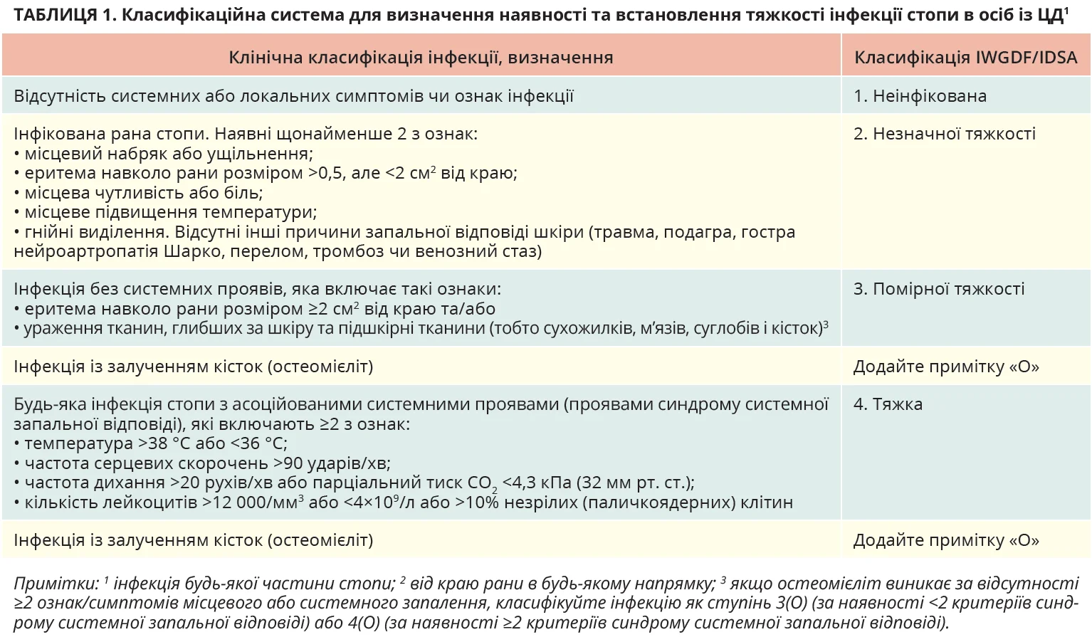 Діагностуйте асоційовані з ЦД інфекції м’яких тканин клінічно, з огляду на місцеві або системні ознаки та симптоми запалення. Оцінюйте тяжкість АДІС за допомогою класифікації Міжнародної робочої групи з діабетичної стопи й Американського товариства інфекційних хвороб (табл. 1).