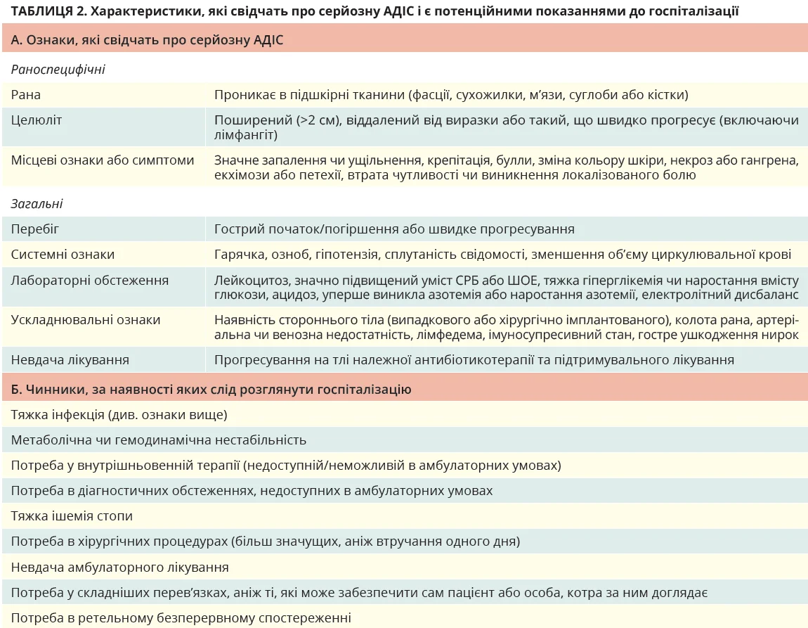 Госпіталізація є дороговартісним ресурсом і для пацієнта асоціюється зі значними незручностями та ризиком нозокоміальних інфекцій. Утім, деякі пацієнти з АДІС однозначно потребують госпіталізації, наприклад особи з тяжкою інфекцією або значущими коморбідностями, як-от ХПА (табл. 2). Слід зауважити, що наявність остеомієліту не завжди потребує госпіталізації, оскільки значна кількість цих хворих є клінічно стабільними та можуть лікуватися пероральними антибіотиками.