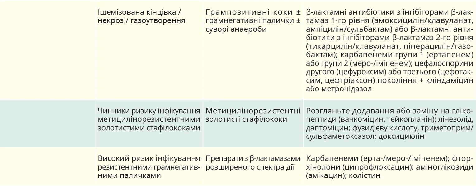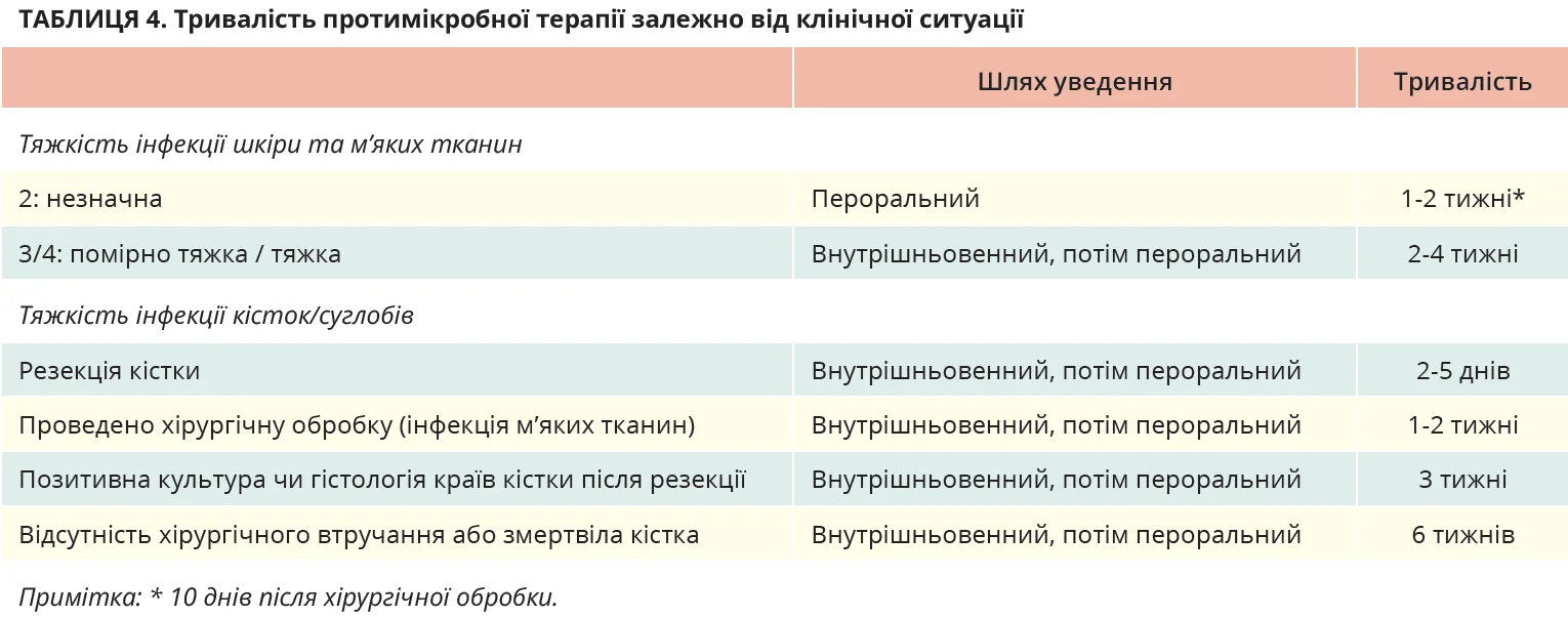 Застосовуйте будь-які схеми системної антибіотикотерапії, котрі, за даними опублікованих рандомізованих клінічних досліджень, продемонстрували ефективність у стандартних дозах у лікуванні осіб із ЦД й інфекціями м’яких тканин стопи. Пацієнтам із діабетичною інфекцією шкіри або м’яких тканин стопи призначайте антибіотикотерапію на 1-2 тижні. Розгляньте продовження лікування (наприклад, до 3-4 тижнів), якщо вираженість інфекції знижується, але вона залишається широкою та зменшується повільніше, ніж очікувано, або якщо пацієнт має тяжку ХПА. Якщо докази наявності інфекції не зникли через 4 тижні адекватного лікування, повторно оцініть стан пацієнта та розгляньте потребу в подальших діагностичних дослідженнях чи альтернативному лікуванні.