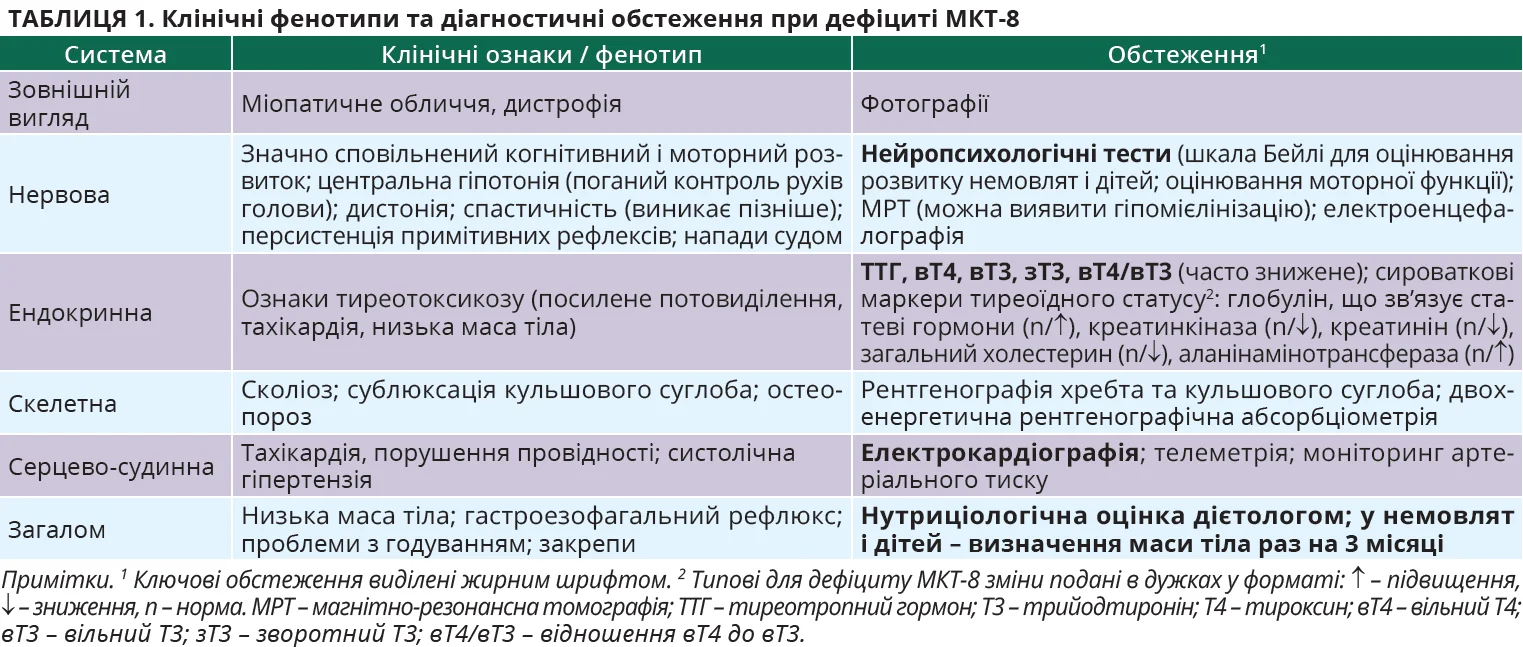 Дефіцит МКТ-8 (синдром Аллана – Герндона – Дадлі) характеризується затримкою неврологічного розвитку різного ступеня, спричиненою мозковим гіпотиреозом, а також широким спектром клінічних наслідків, зумовлених тиреотоксикозом периферичних тканин унаслідок підвищеної концентрації трийодтироніну (Т3) у сироватці крові (табл. 1).