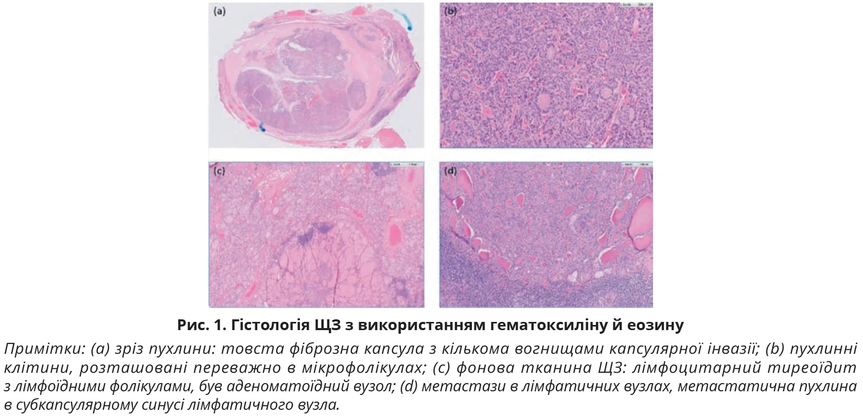 Нарешті пацієнтка погодилася та пройшла повну тиреоїдектомію й селективну дисекцію шиї зліва (II-IV) в липні 2020 року. Гістологія зразка ЩЗ показала фолікулярну карциному pT3aN1b, широко інвазивну: 3 із 26 лімфатичних вузлів були позитивними на злоякісність (рис. 1). Функція ЩЗ відповідала субклінічному гіпертиреозу за день до тотальної тиреоїдектомії. Головний лікар пояснив це нетиреоїдним захворюванням, оскільки пацієнтка була клінічно еутиреоїдною (гормональне тло в межах норми, симптоми відсутні). У післяопераційний період вона розпочала замісну терапію левотироксином у дозі 1,7 мкг/кг/день. Через 3 місяці після тиреоїдектомії було заплановано лікування радіоактивним йодом (RAIT) із застосуванням стероїдів за скасування тироксину.